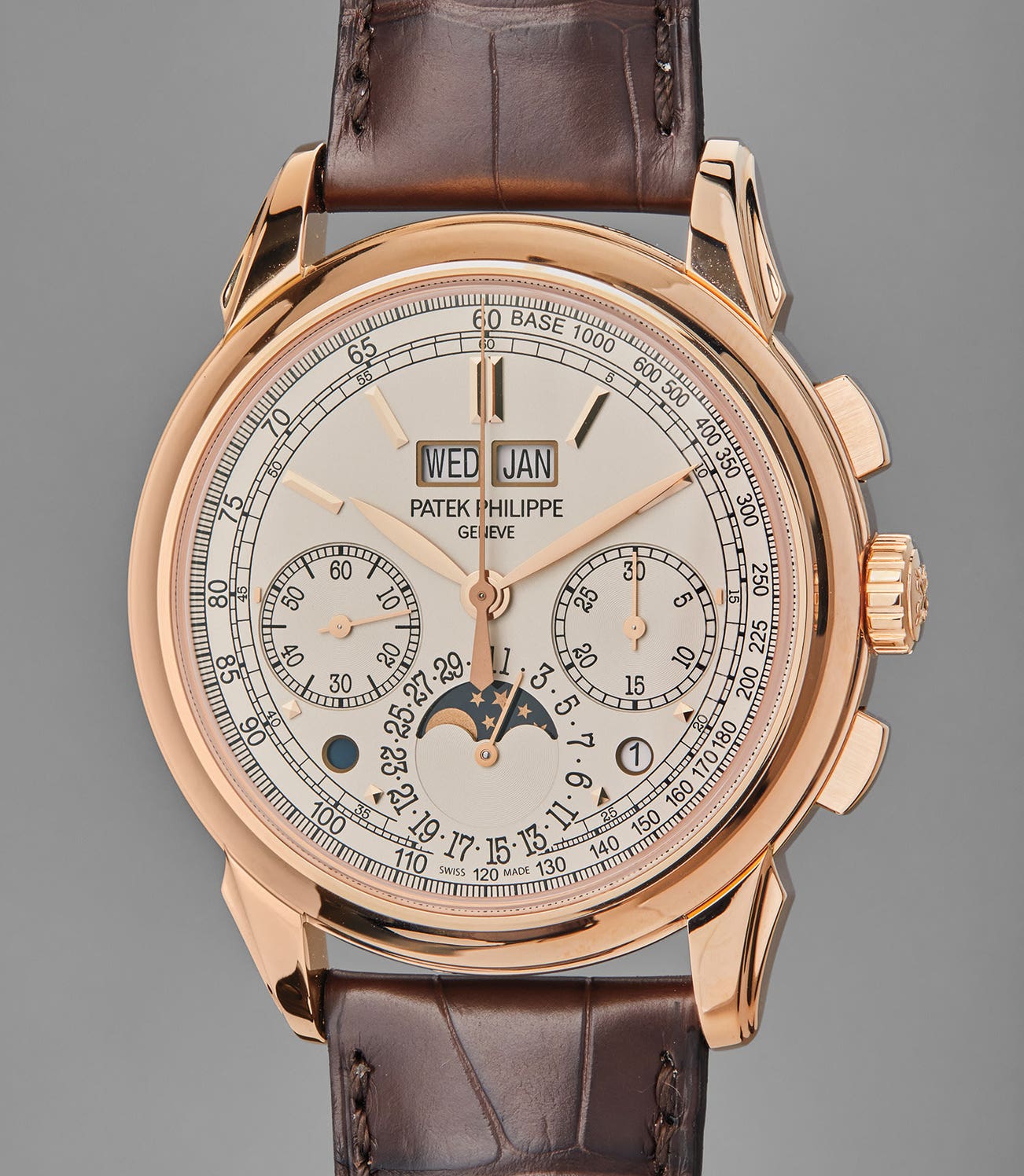 Four years after its launch, the model was introduced with an 18 karat rose gold case, like the present example, in 2015, following platinum-cased models released the year prior. Fitted within a very wearable 41mm diameter case, its symmetric dial has a symmetry reminiscent of vintage models, and modernised with night and day indication. Applied rose gold hour markers and rose gold feuille hands perfectly match the case. The hands and numerals on the 5270R match the case, and are a wonderful juxtaposition. Since its introduction, the model has seen several iterations, as seen with so many of the brand’s past models. The changes have been observed with the dial over three series: