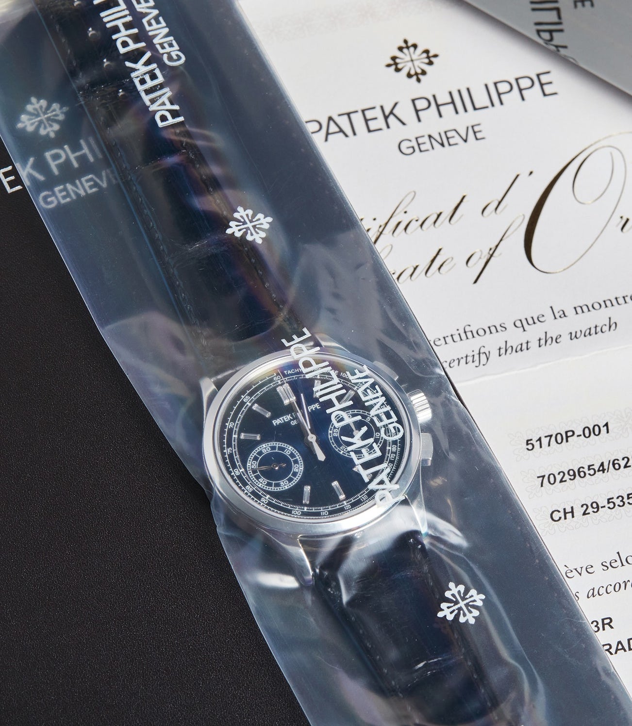 In factory sealed, new condition, it comes complete with its original certificate of origin, box and hang tag. The reference 5170P is an exemplary chronograph, and this pristine example is a rare opportunity for the connoisseur.