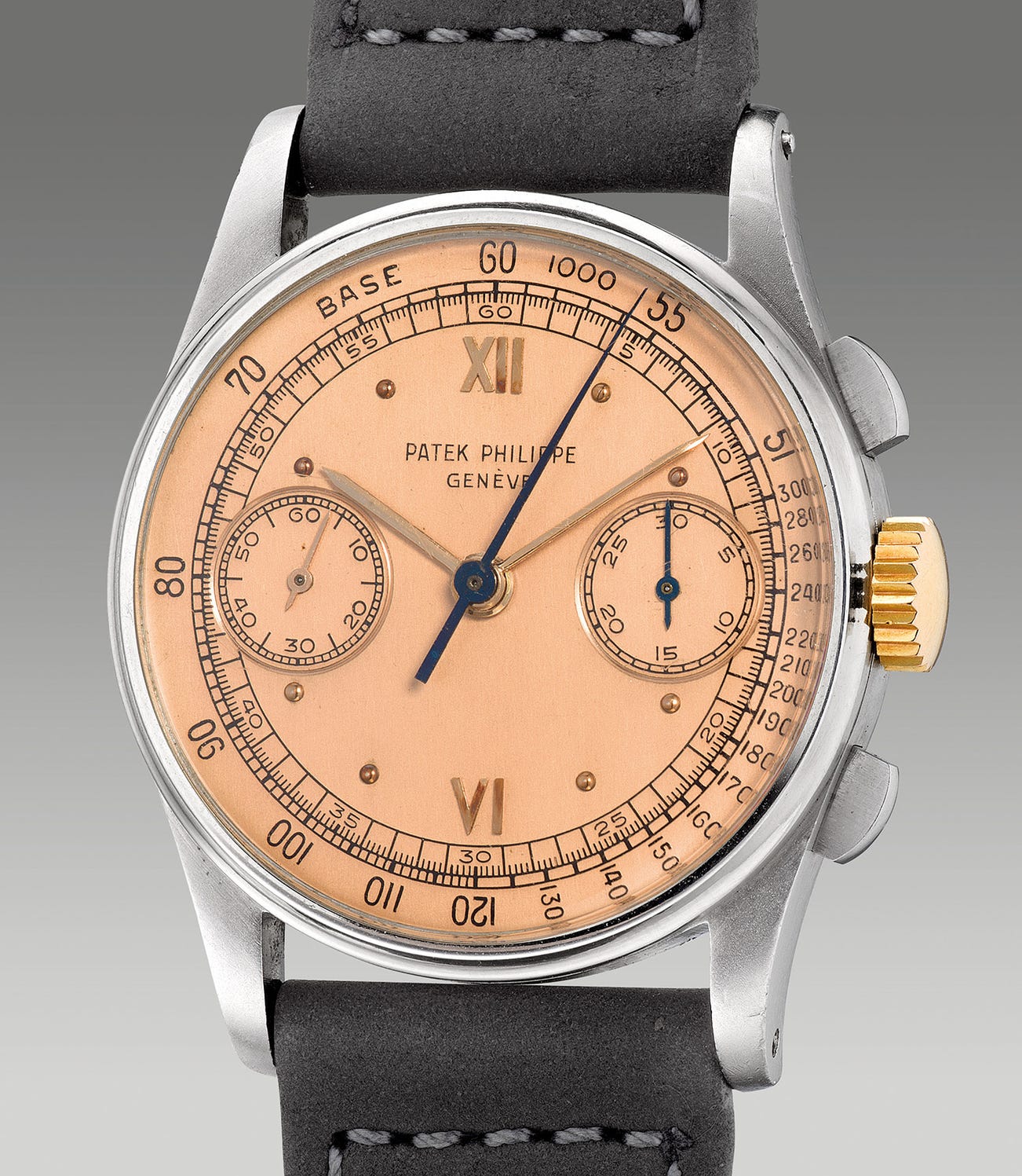 The present example belongs to one of the rarer variants of the coveted Patek Philippe ref. 130 from 1941 belonging to the first series with a 505’7XX serial stamped inside the caseback. Featuring a rare and desirable “salmon” dial with applied pink gold dotted indexes and Roman numerals, the present example is also fitted with a yellow gold crown making this unusual two tone variant very rare. Furthermore inside the caseback it is stamped “4”, meaning that the present timepiece was the 4th example from the batch. With a combination of condition, rarity and importance, the present ref. 130 is further accompanied by an Extract from the Archives issued by Patek Philippe confirming the date of production of the present timepiece in 1941 with a satin-finished rose dial and raised pink gold hour markers and its subsequent date of sale on 5th March 1942.