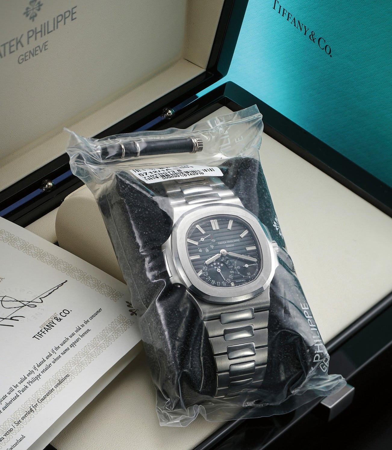 Displaying a date, power reserve and moon phases complication, reference 5712 was the successor of reference 3712. It is immediately recognizable from its predecessor due to the lack of hour marker at 7 o'clock. Made to celebrate the 30th anniversary of the famous Nautilus collection in 2006, the model was a commercial success. Its good looks, combined with a hefty presence makes it one of the most desirable modern sports watches available on the market today. In fact, it is incredibly difficult to obtain one at a Patek Philippe retailer, requiring years of waiting to be allocated one. That is even more true - in fact at a superior level of magnitude - when it comes to the extremely sought-after and collectible Tiffany signed examples.