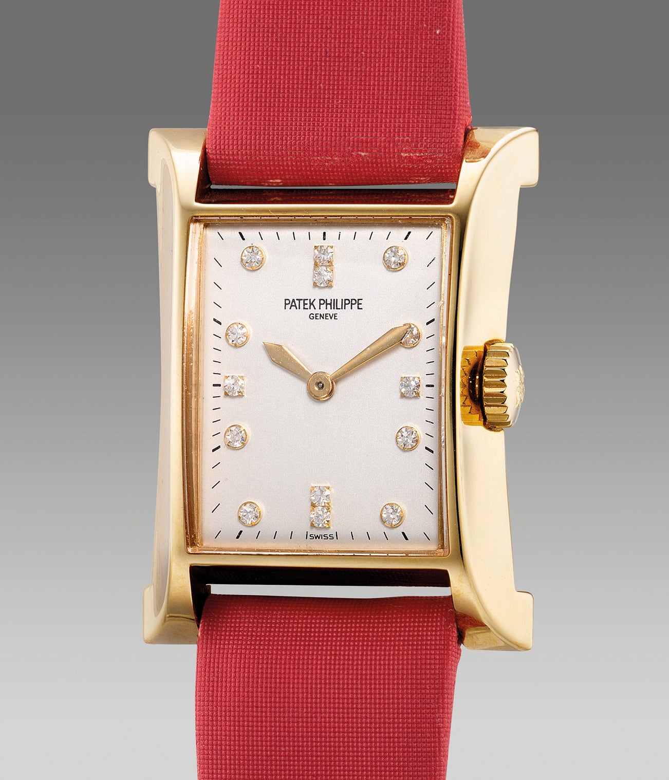A lady’s elegant and rare limited edition yellow gold rectangular-shaped wristwatch with diamond-set indexes, made to commemorate the inauguration of Patek Philippe’s Geneva watchmaking center in 1997