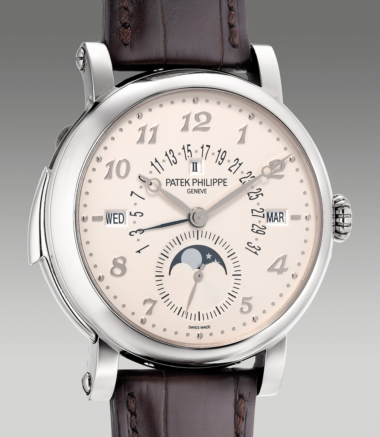 An extremely fine, exceptional and rare white gold minute repeating perpetual calendar wristwatch with small seconds, moon phases, retrograde date, leap year indication, Breguet numerals, officer-style caseback, Certificate of Origin and presentation box