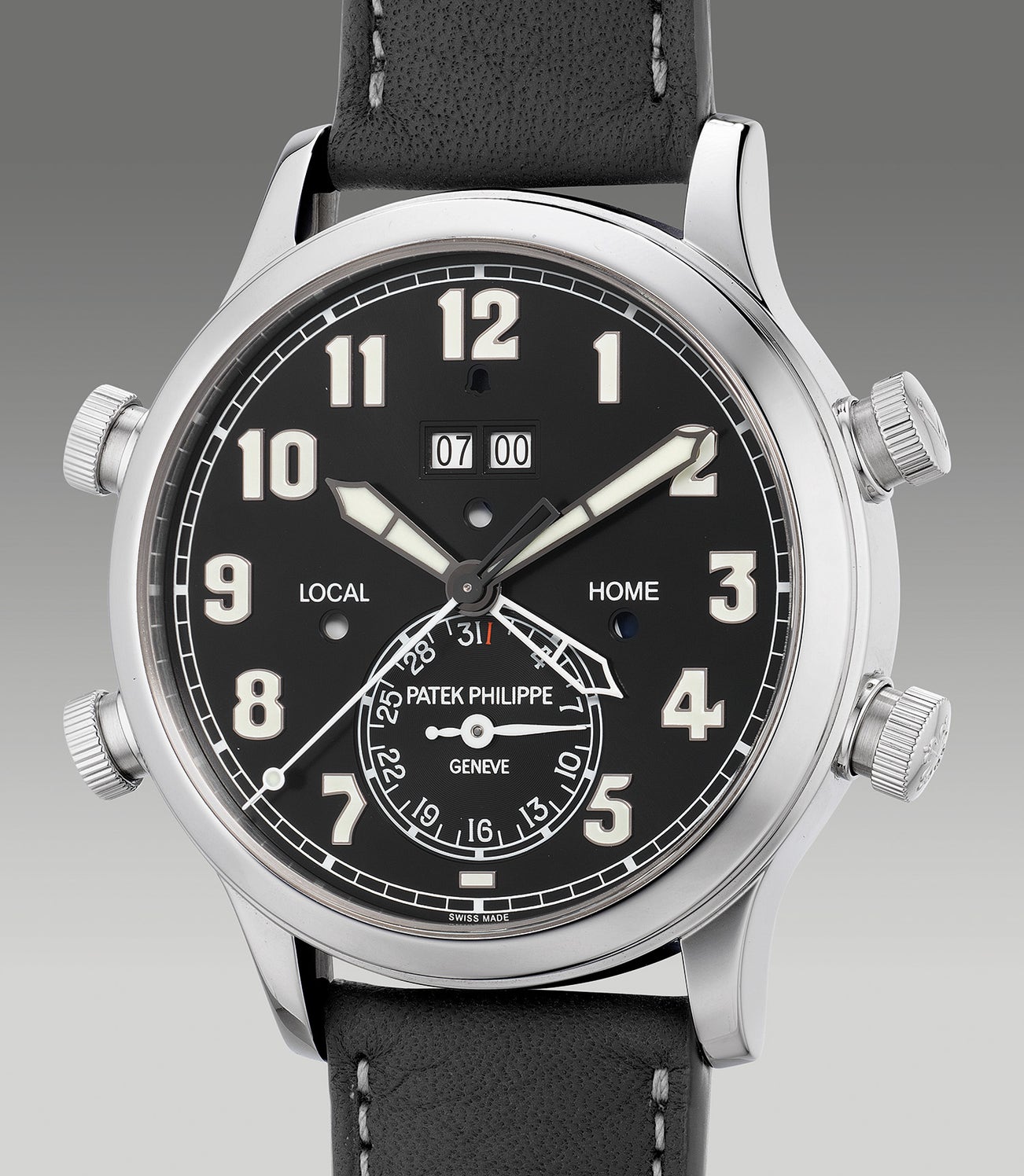 An extremely rare and technically impressive platinum dual-time wristwatch with center seconds, 24-hour alarm, on and off indication, date, day and night indication, Certificate of Origin and presentation box