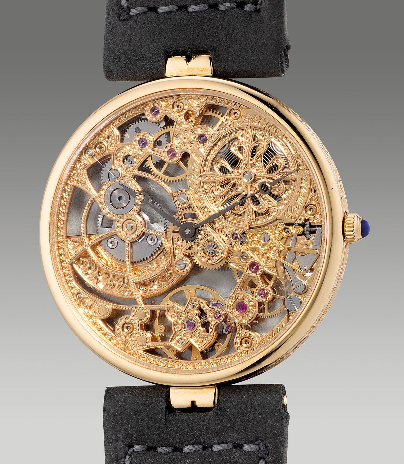 A fine and rare yellow gold skeletonized wristwatch with Certificate of Origin and presentation box
