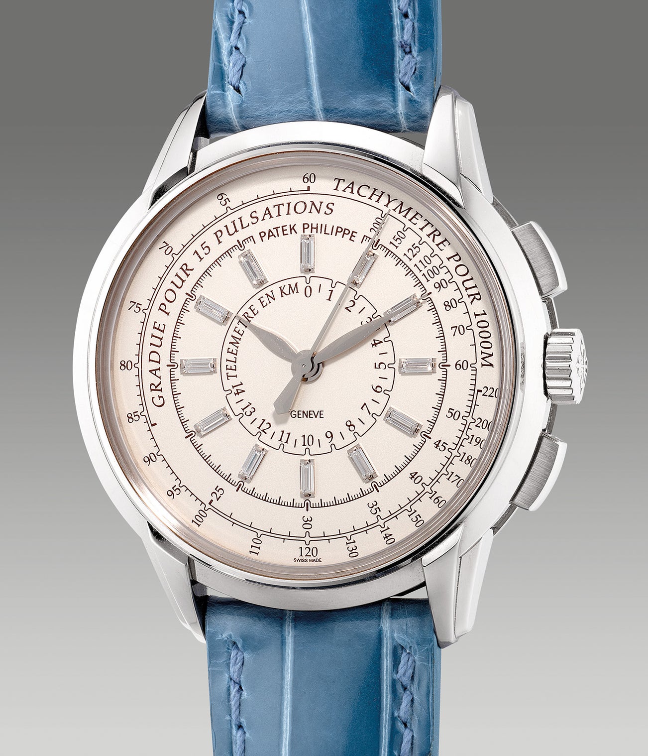 A lady’s attractive and rare limited edition white gold multi-scale chronograph wristwatch with diamond-set indexes, Certificate of Origin and presentation box, limited edition of 150 pieces, made to commemorate the 175th Anniversary of Patek Philippe