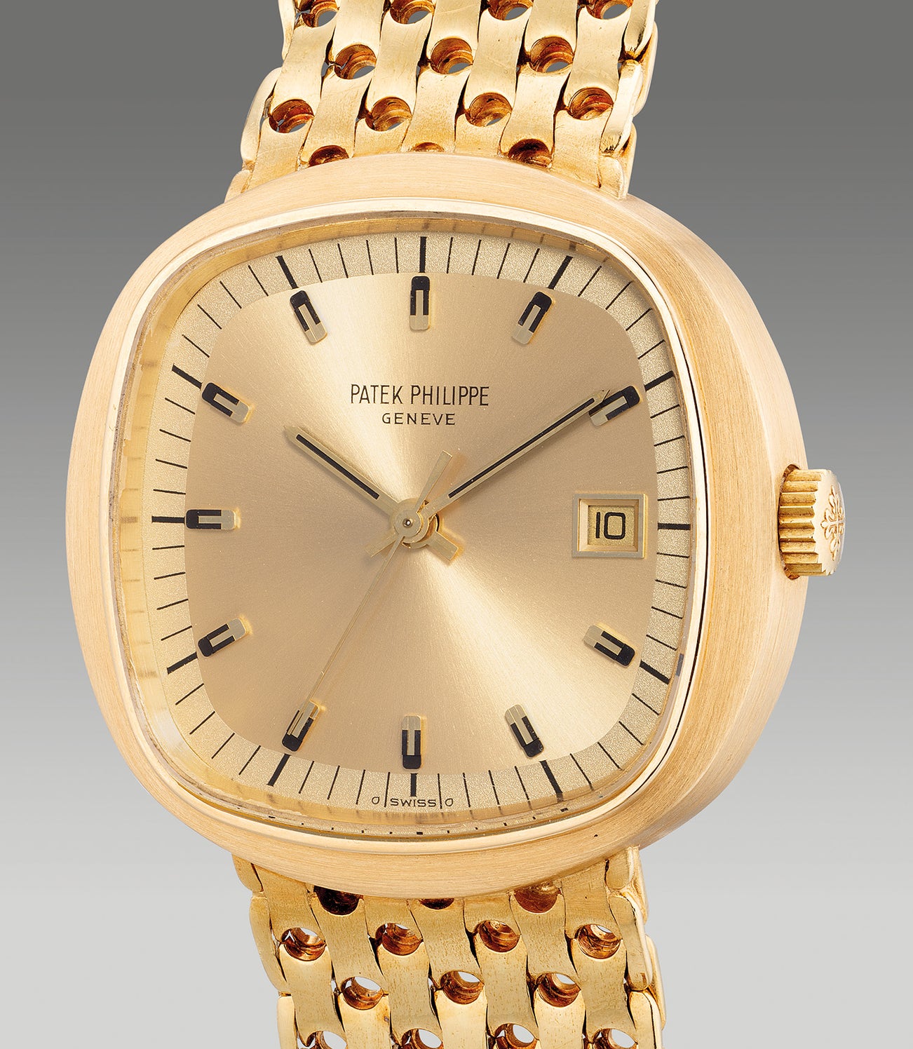 A very rare, attractive and oversized yellow gold cushion-shaped quartz wristwatch with center seconds, date, two-tone champagne dial and integrated bracelet