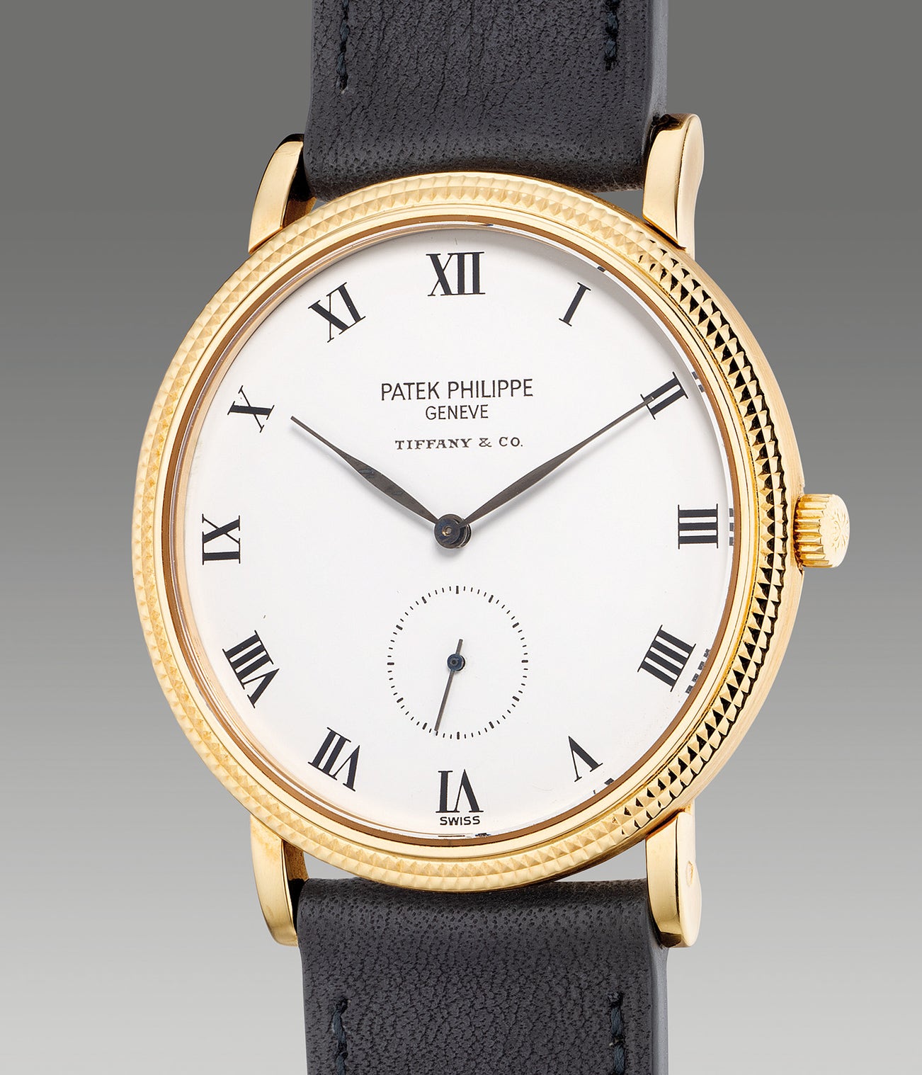 A very rare and attractive yellow gold wristwatch with “Clous de Paris” bezel, white porcelain dial, painted Roman numerals and small seconds, retailed by Tiffany & Co.