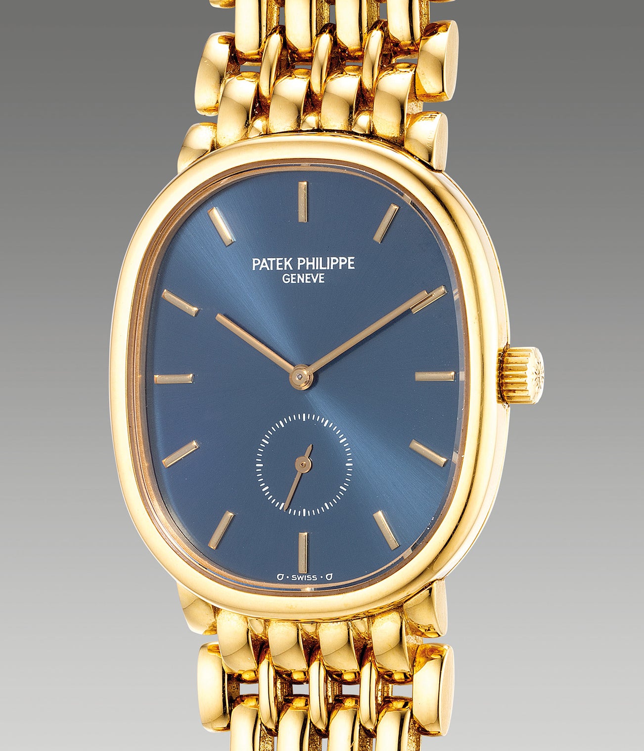 By the end of the 1970s, the Golden Ellipse had a lineup of no less than 65 variations. The reference 3978 debuted in 1981, was the first Ellipse to ever feature a subsidiary seconds on the dial. Fitted with a captivating blue sunburst dial and gold markers, the dial shimmers with elegance, the present example also features a handsome integrated gold bracelet. Furthermore, the present lot is charmed with a pair of matching gold cufflinks tailored to match with any formal attire. Highly regarded as a cult classic and dares to be unique, the present example is certainly a perfect timepiece for the exquisite individual.