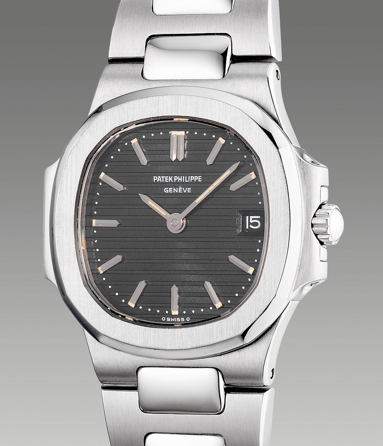 In production for over 23 years until it was discontinued in 2004, the Patek Philippe lady’s Nautilus ref. 4700 was offered with many different variations. The present example in stainless steel with an ashen gray ribbed dial is truly a classic. Offered in excellent overall condition with extremely minimal signs of use and wear plus complete with its full set of accessories, this is truly the perfect everyday timepiece for the discerned lady collector today.