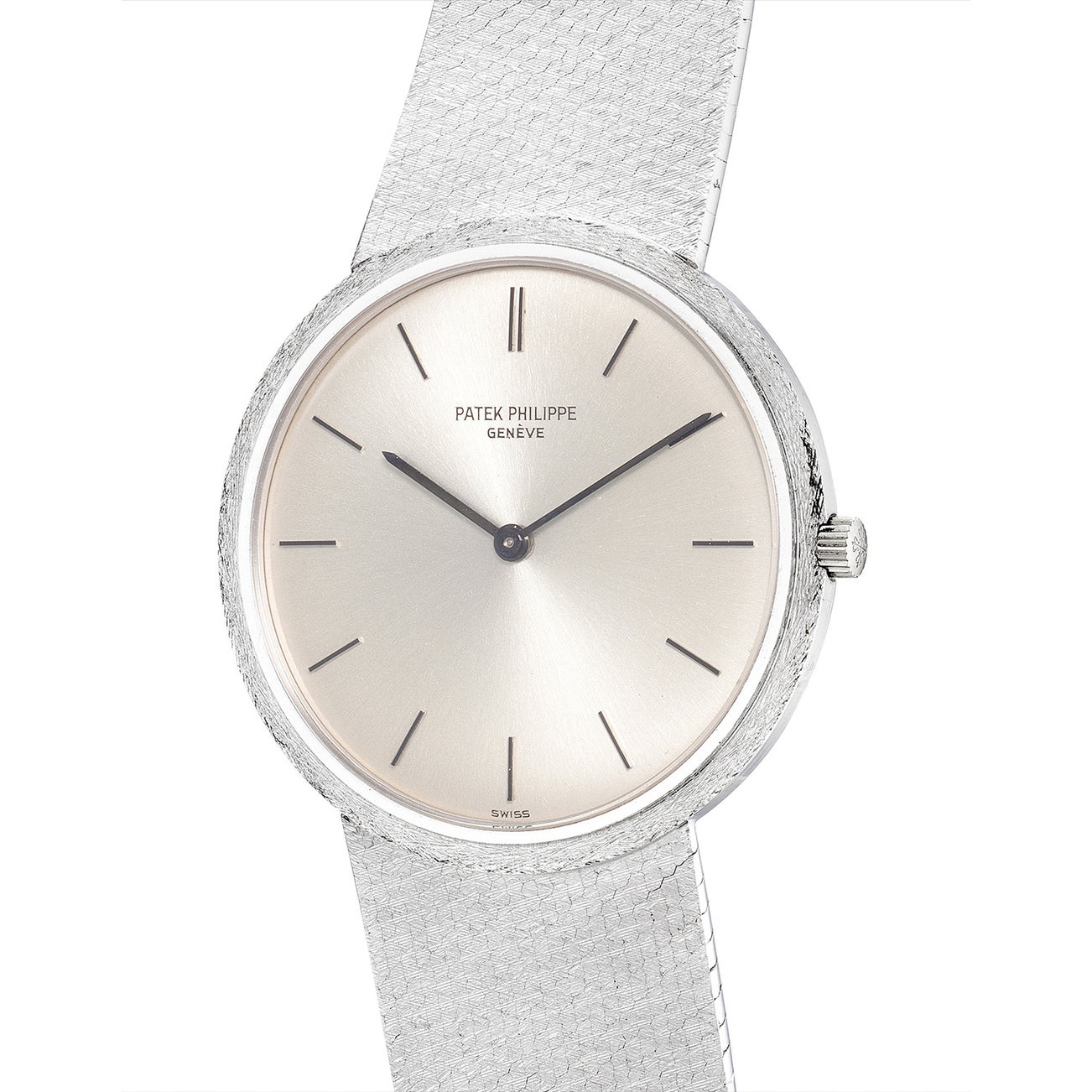 The present example ref. 3520/12 belongs to the first series production in white gold features a bark-finished case with a charismatically matching integrated bracelet made by master bracelet maker Jean-Pierre Ecoffey confirmed by a Patek Philippe Extract from the Archives indicating its bracelet in white gold.