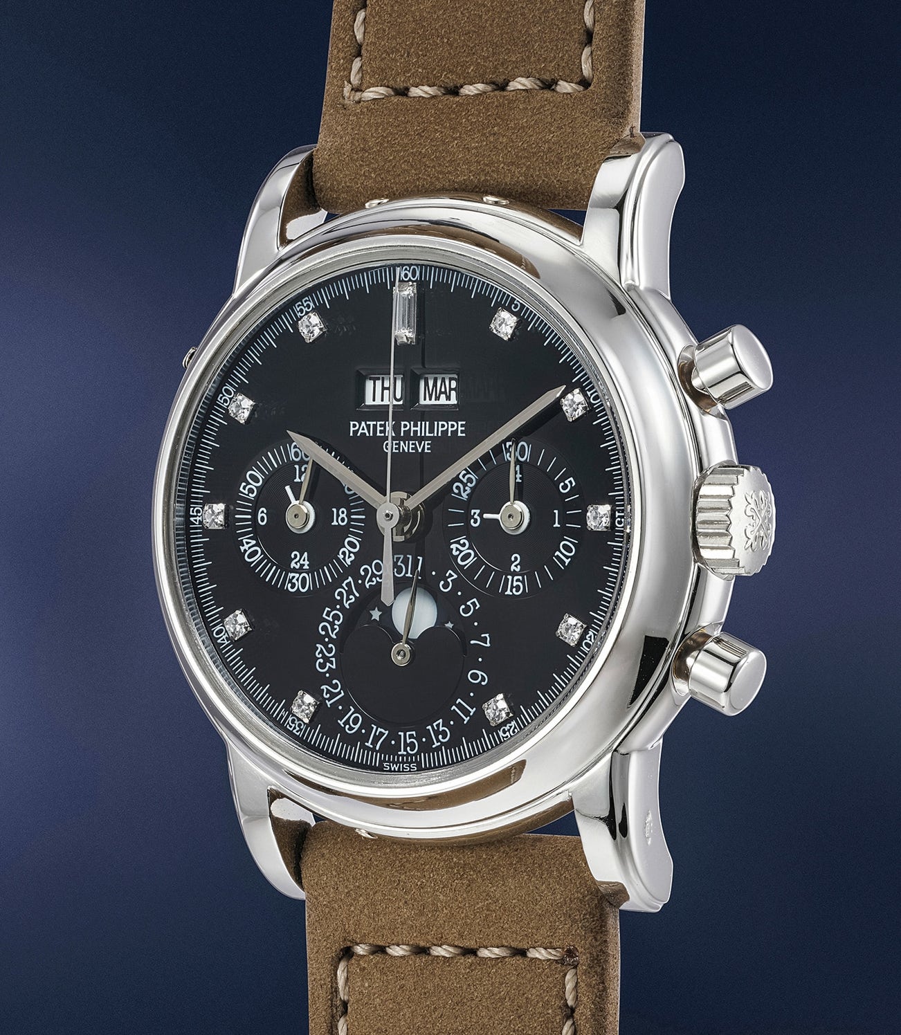 The present example, displaying a black dial with diamond indexes, is encased in platinum and assigned the referenced 3970E (“E” – étanche meaning waterproof). It is offered in excellent condition with its Patek Philippe Certificate of Origin dated February 1998 and stamped Beyer Chronometrie, additional numbered case back, setting pin, presentation box and outer packaging.