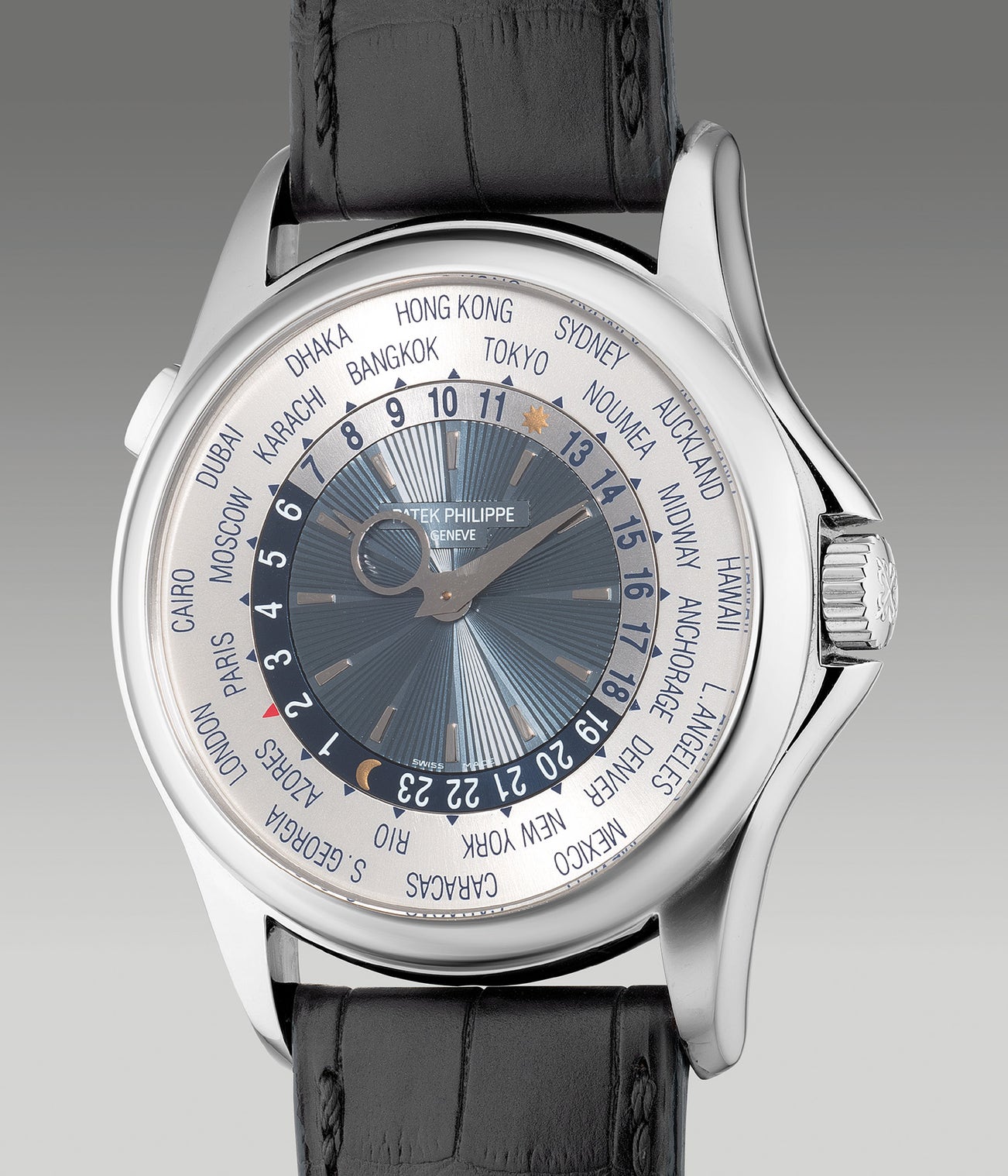Launched in 2006 replacing its predecessor ref. 5110, the ref. 5130 features a platinum case graced with the ingenious world time complication. Instantly adjustable by a simple press of the pusher at 10 o’clock, the timepiece is tailored for the modern day jetsetter. First released in yellow, pink and white gold, followed by platinum in 2007 like the present example. Fashioning in its modern aesthetics, it is notable that the firm kept the ring-shaped hour hand as a salute to the historic Patek Philippe world time watch design. The reference was discontinued in 2016 making way for the ref. 5230.