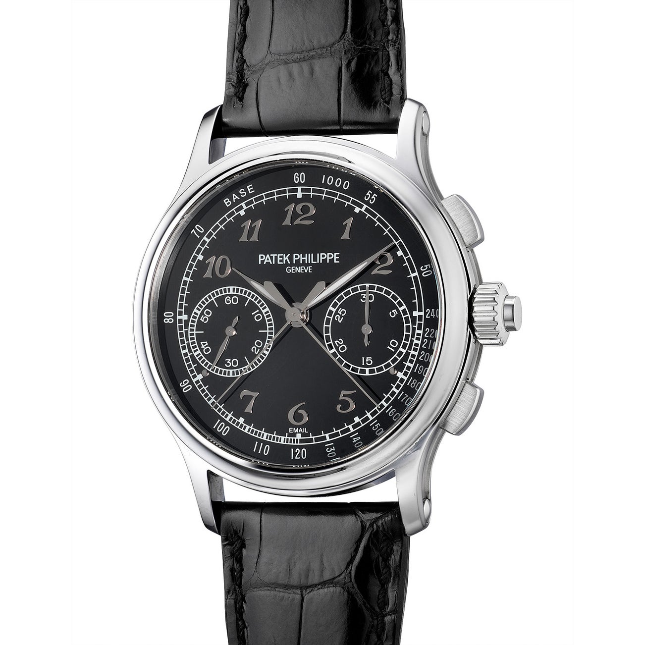 A superlative and rare platinum split seconds chronograph wristwatch with black enamel dial, Breguet numerals, additional solid caseback, Certificate of Origin and presentation box