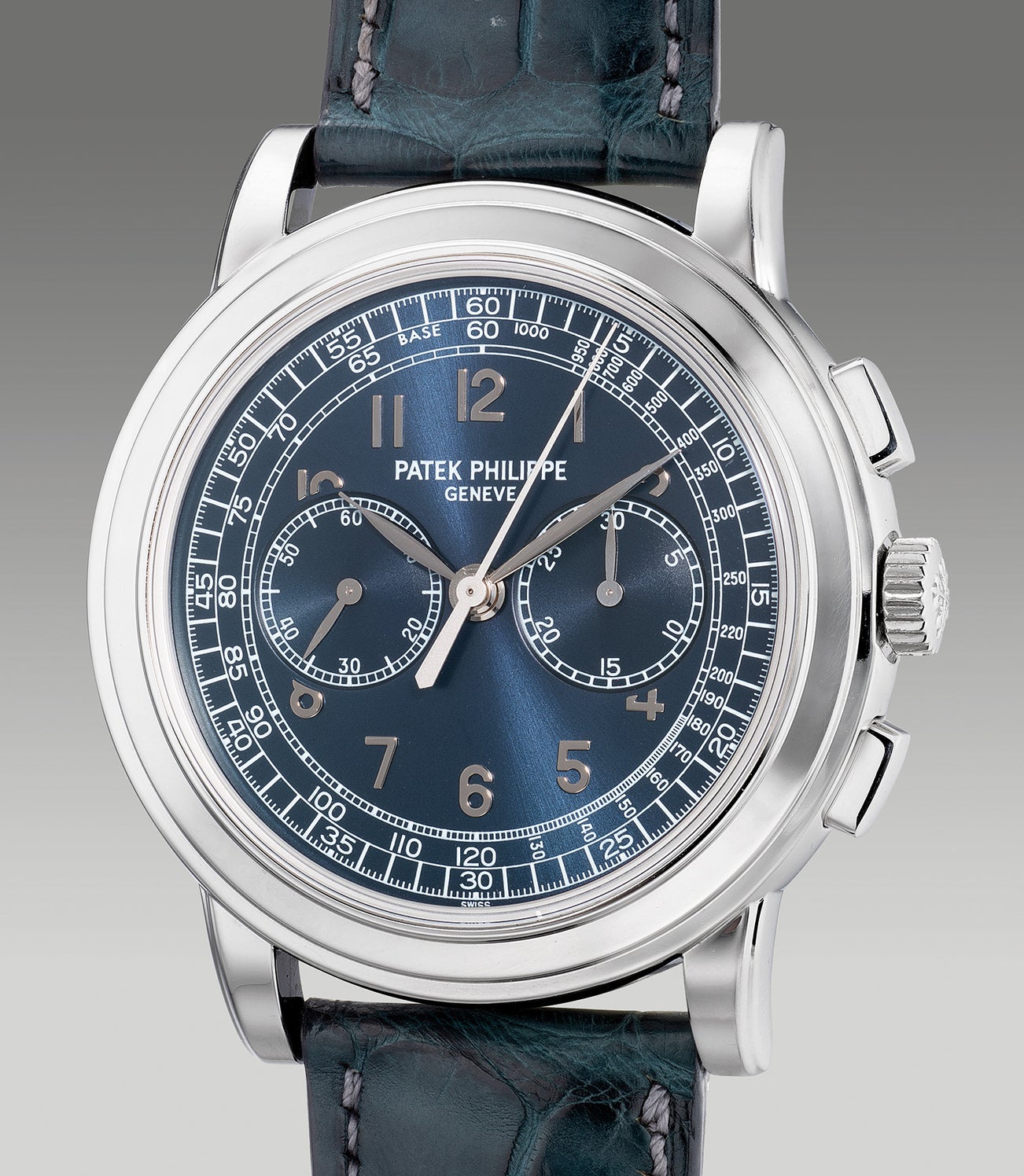A very fine and rare platinum chronograph wristwatch with blue dial, Certificate of Origin and presentation box