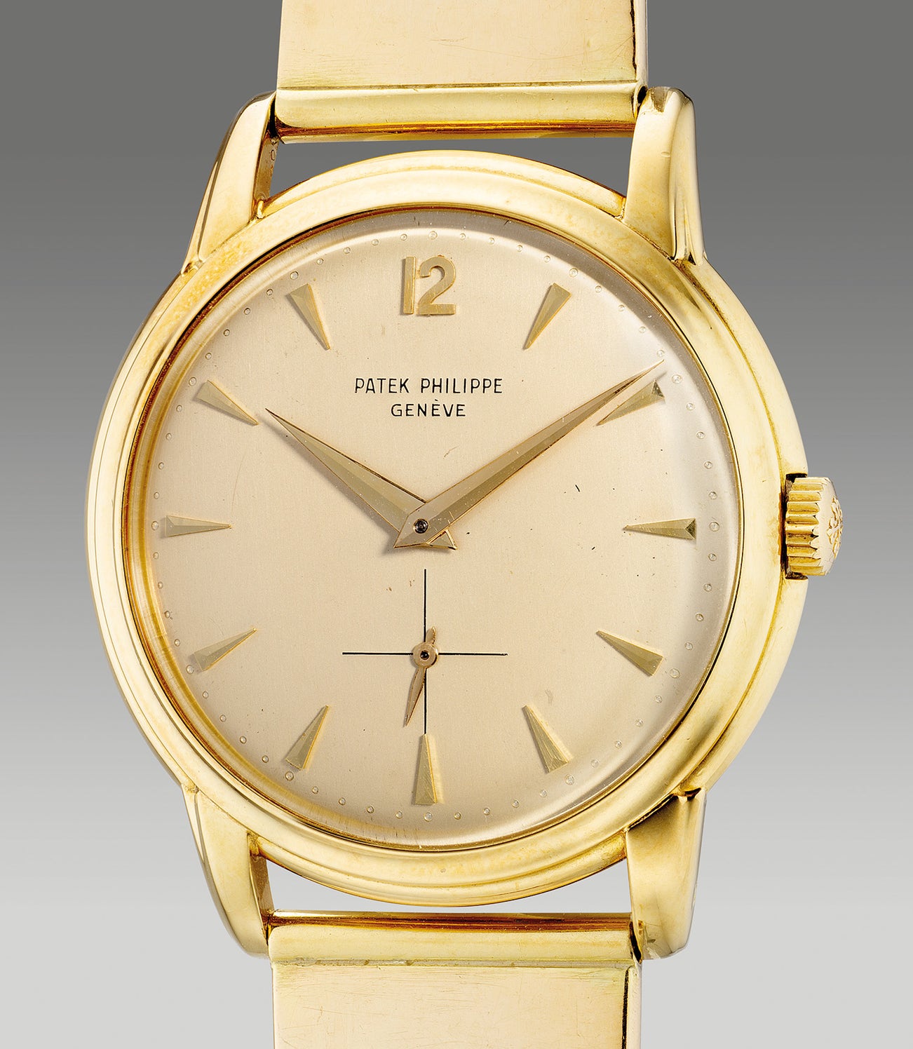 The present example Patek Philippe ref. 2551 in yellow gold from 1955 is fitted with a rare and attractive yellow gold Gay Frères brick bracelet from the respective era and is further stamped by Patek Philippe. Immediately enhancing the value and appeal of the present example, it is also delivered with a Patek Philippe Extract from the Archives confirming the production of the present timepiece.