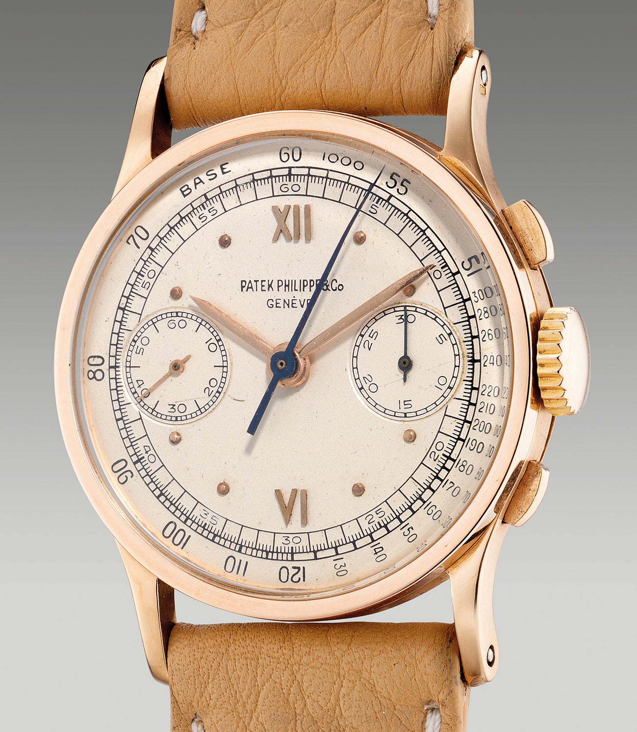 Very rare, it is estimated that only 330 examples of the reference was produced from 1937 to 1957 across all metals. The reference was encased predominantly in pink gold with an estimated 215 examples, 125 examples in yellow gold and 10 examples in other rare metals. An unusual circumstance, it is rarely seen that pink gold cases were produced in larger quantities than yellow gold examples. It is believed that at the time, the design of the timepiece and its case in pink gold were highly demanded in the southern European and the South American market. Stamped with two rare and unusual Portuguese hallmarks on the caseback, the hallmarks indicate that the present timepiece was imported to Lisbon, Portugal. It is believed that only a handful of examples featuring the two Portuguese hallmarks have appeared in recent times and was utilized between 1938 - 1984.