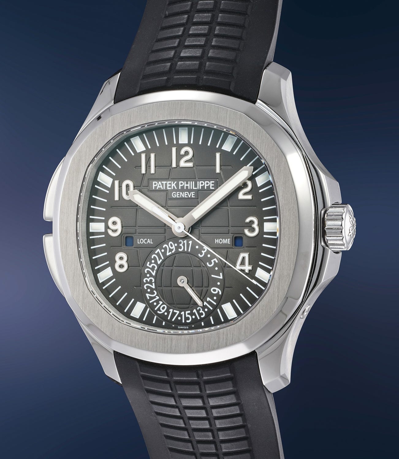 A fine and attractive stainless steel dual time wristwatch with center seconds, date, day and night indication, certificate of origin and presentation box