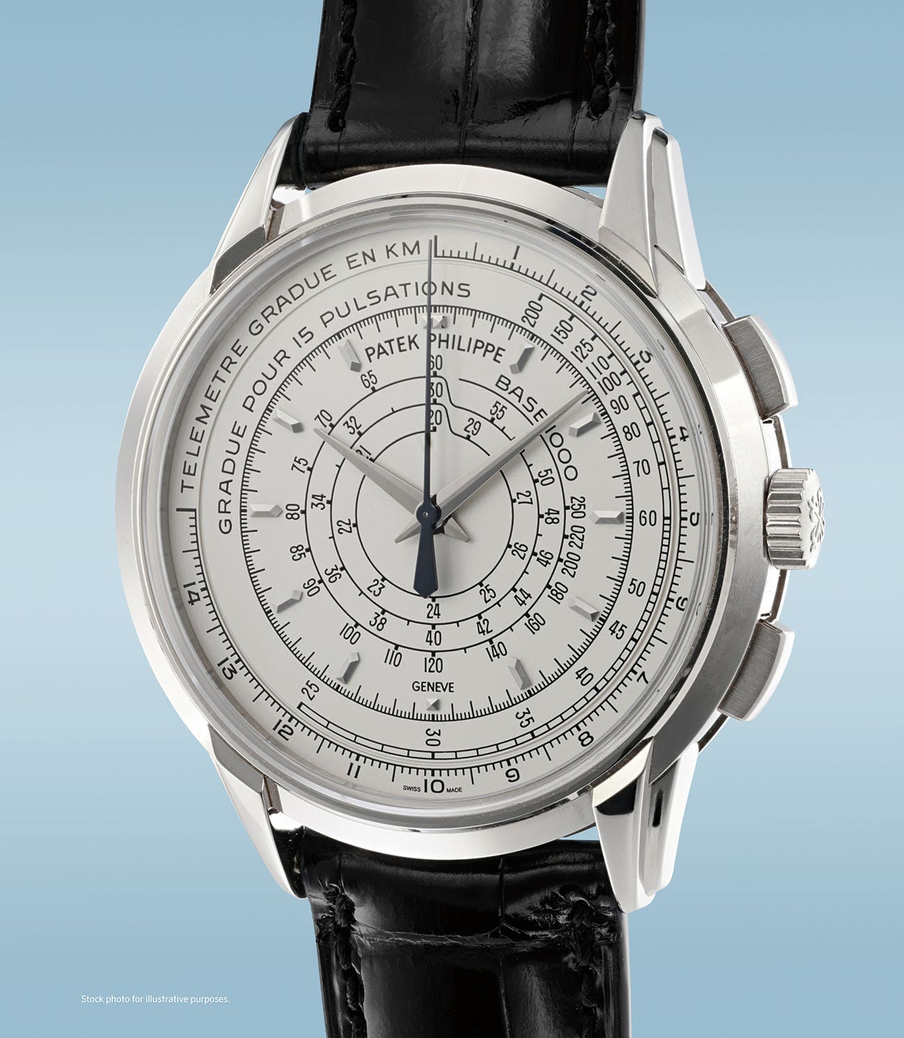 Released in 2014, the 5975 was housed in a striking 40mm diameter case, and its dial featured three scales permitting instantaneous measurements: a pulsometer, calibrated to 15 pulsations for heart rate, a telemeter scale to indicate distance based on the speed of light and speed of sound, and a tachymeter, used to measure speed over distance. Housing Patek Philippe’s in-house, automatic chronograph caliber, the CH28-520, the chronograph mechanism is able to operate at all times with no effect on accuracy or additional wear due to the innovative vertical clutch mechanism. The silvered opaline dial is brilliant, with an enamel-like shimmering effect, and its case, with stepped Art Deco-style lugs are another pleasing nod to the past. The model was produced in 400 examples in yellow, white and pink gold, with 100 examples in platinum with black dial.