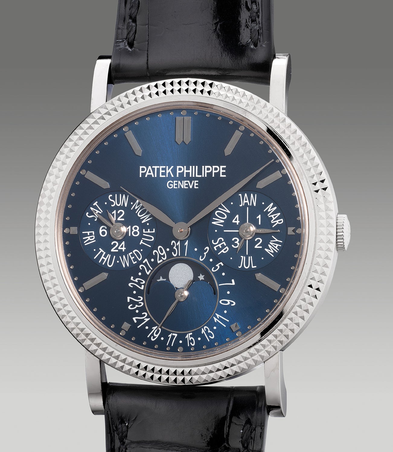An exceedingly rare and attractive white gold perpetual calendar wristwatch with moon phases, 24-hour indication, leap year indication, “Clous de Paris” bezel, additional solid caseback, Certificate of Origin and presentation box