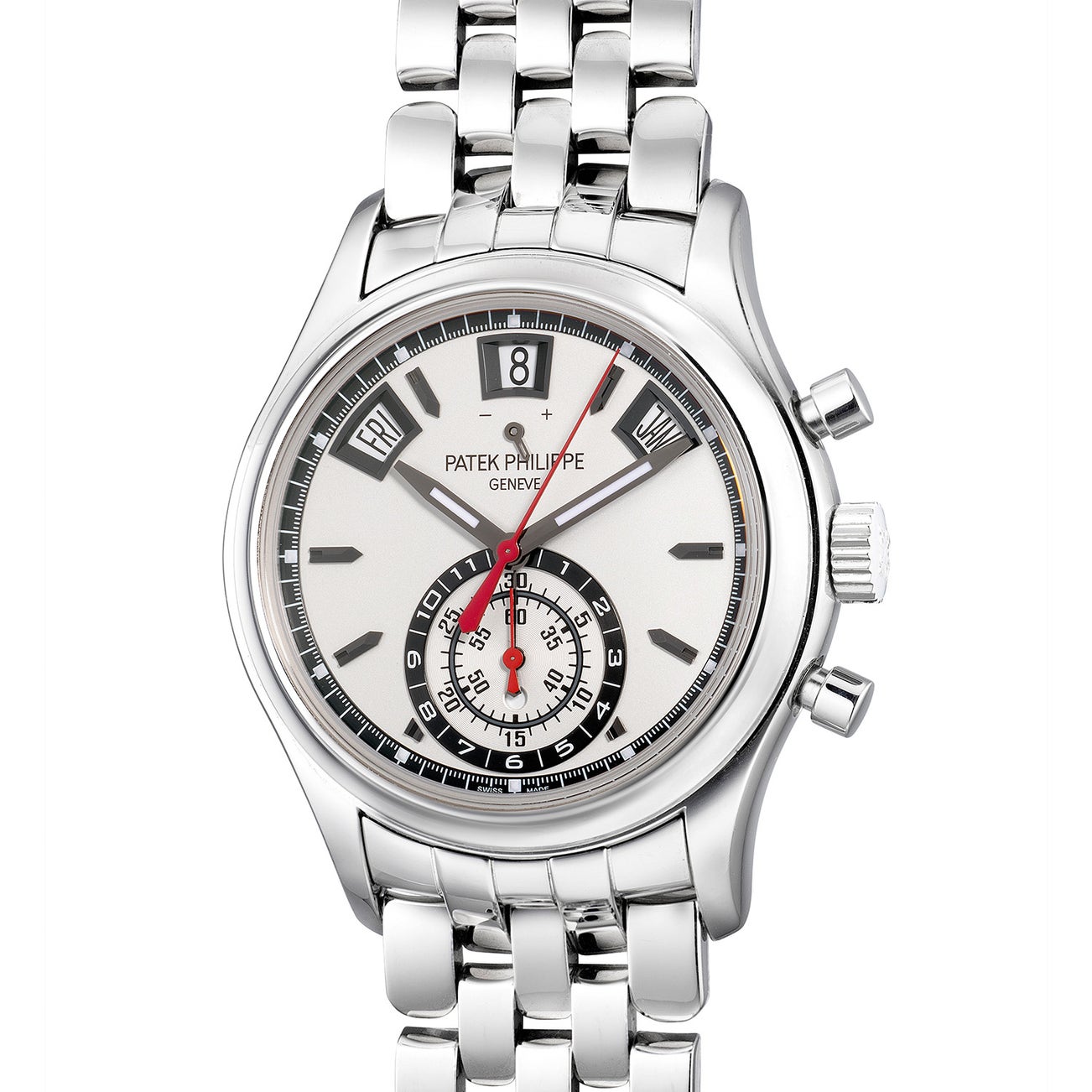 The present example reference 5960 is offered in excellent overall condition with its certificate of origin and accessories. Designed and built to suit every active enthusiasts, this annual calendar flyback chronograph with a sharp white dial is perfect for any occasion.