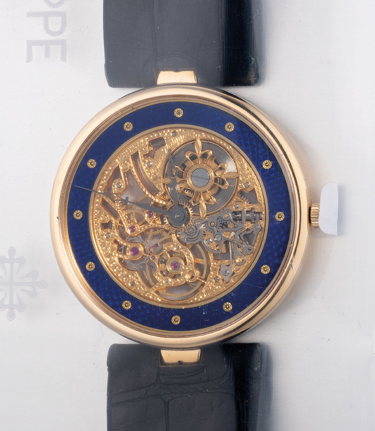 A fine and attractive yellow gold skeletonized wristwatch with blue enamel dial, service sealed