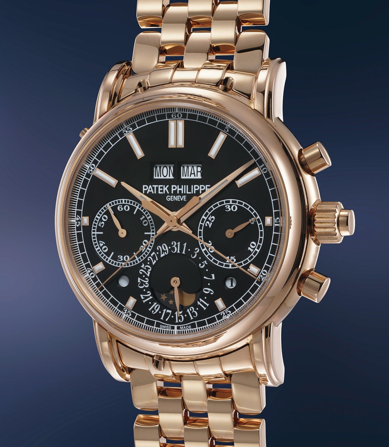 A flamboyant and attractive pink gold perpetual calendar, split seconds chronograph with moon phases and bracelet