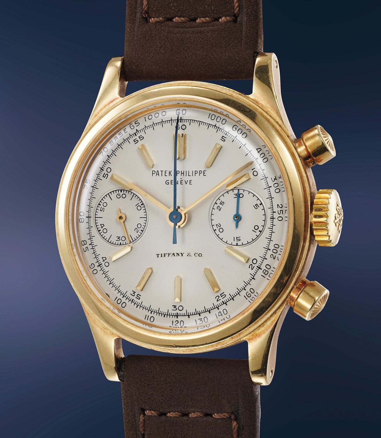 An extremely rare and spectacularly well-preserved yellow gold chronograph wristwatch, retailed by Tiffany & Co.