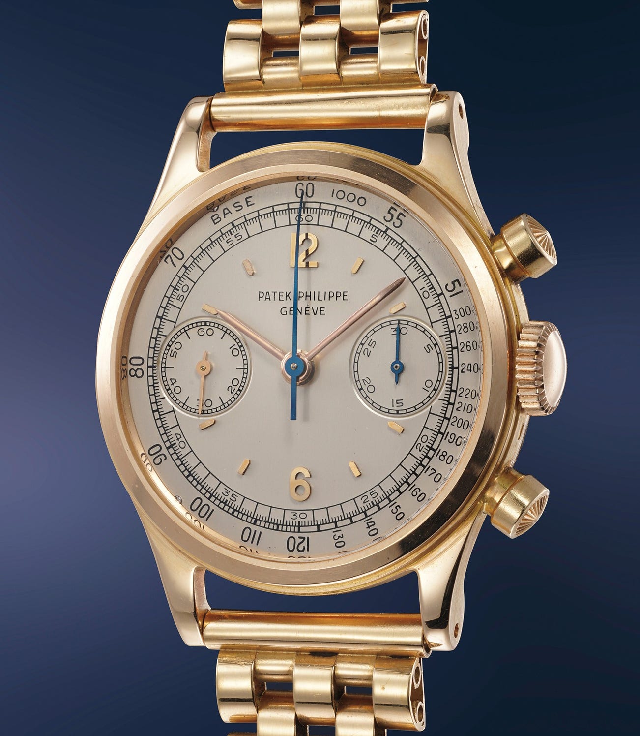 The case of the present example is in wonderful condition, displaying crisp hallmarks, most notably the one on the band is as well-preserved as the one underneath the lug. The case features the stepped bezel and downturned curved lugs found on later generations, while the dial is exceptionally well-preserved with all the engraved/enameled graphics in excellent condition and without losses or fading. The presence of a pink gold Gay Frères bracelet is the final addition to this masterpiece and perfectly complements its luxurious sporty ethos. In fact, the bracelet is highly collectible in itself as Gay Frères is considered one of the best - if not the best overall - bracelet makers of all times, his creations as scarce as they are sublime and comfortable. It is no surprise that the company was the “go-to” bracelet supplier for the most distinguished brands on the market (for another example of Gay Frères bracelet, see the white gold reference 2497, lot 122).