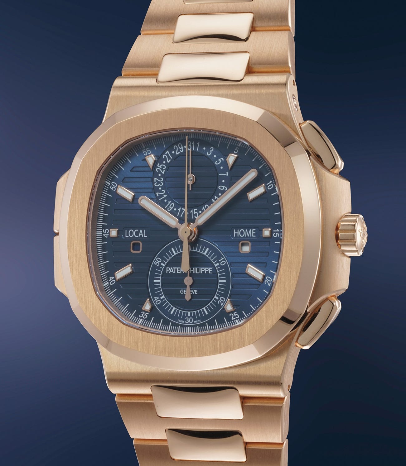 A highly attractive and supremely impressive pink gold dual time chronograph wristwatch with date, double day/night indication, blue dial, bracelet, certificate and box