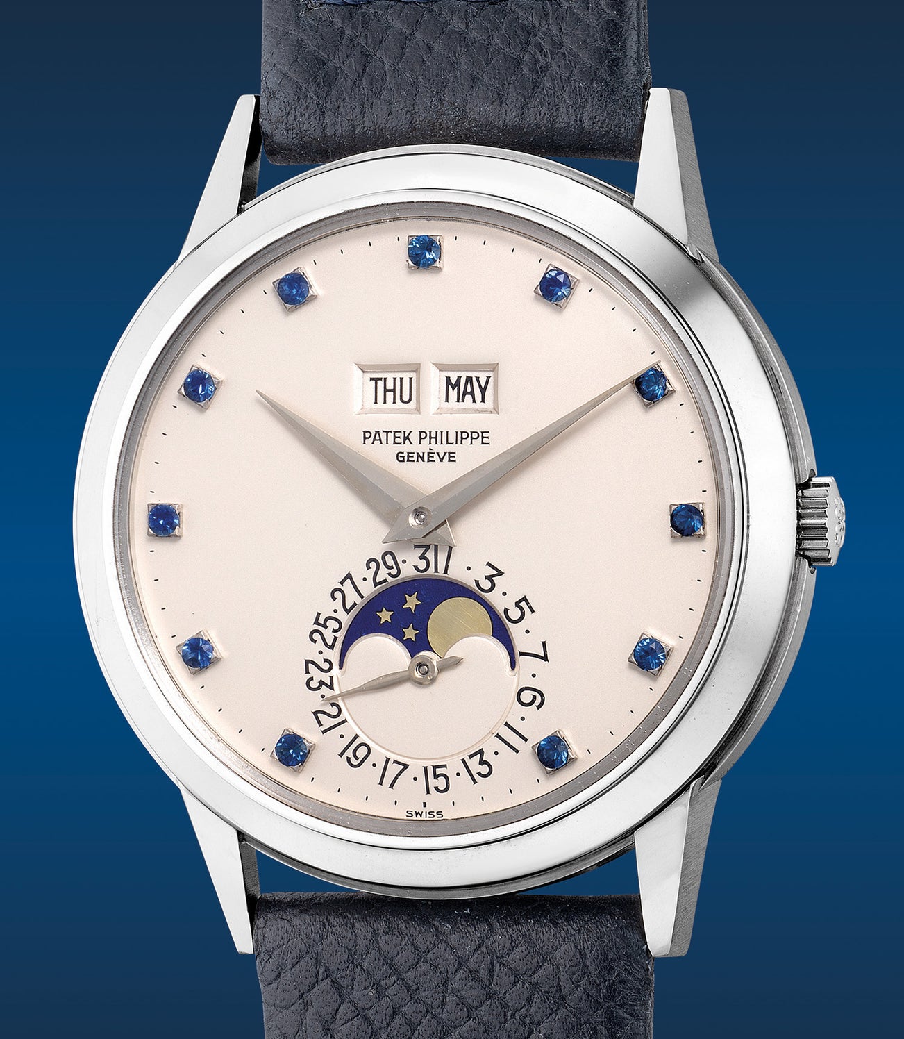 While it is known that the ref. 3448 was available for order with diamond and ruby-set indexes, the present timepiece is the only example of the reference in platinum with sapphire-set indexes. Moreover, to our knowledge and through extensive research, the present example is perhaps the only complicated Patek Philippe reference cased in platinum from the respective era (disregarding the ref. 3970 and onwards) to feature sapphire-set indexes, making this already rare timepiece in its case, unique.
