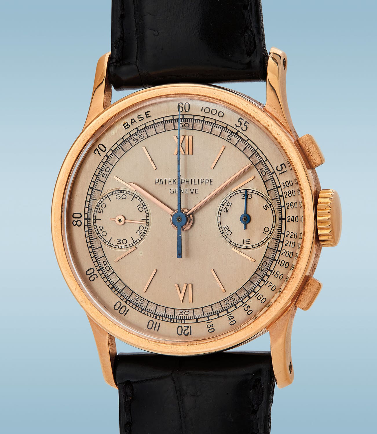 A very rare and fine 18K pink gold chronograph wristwatch with two-tone dial and tachymeter scale