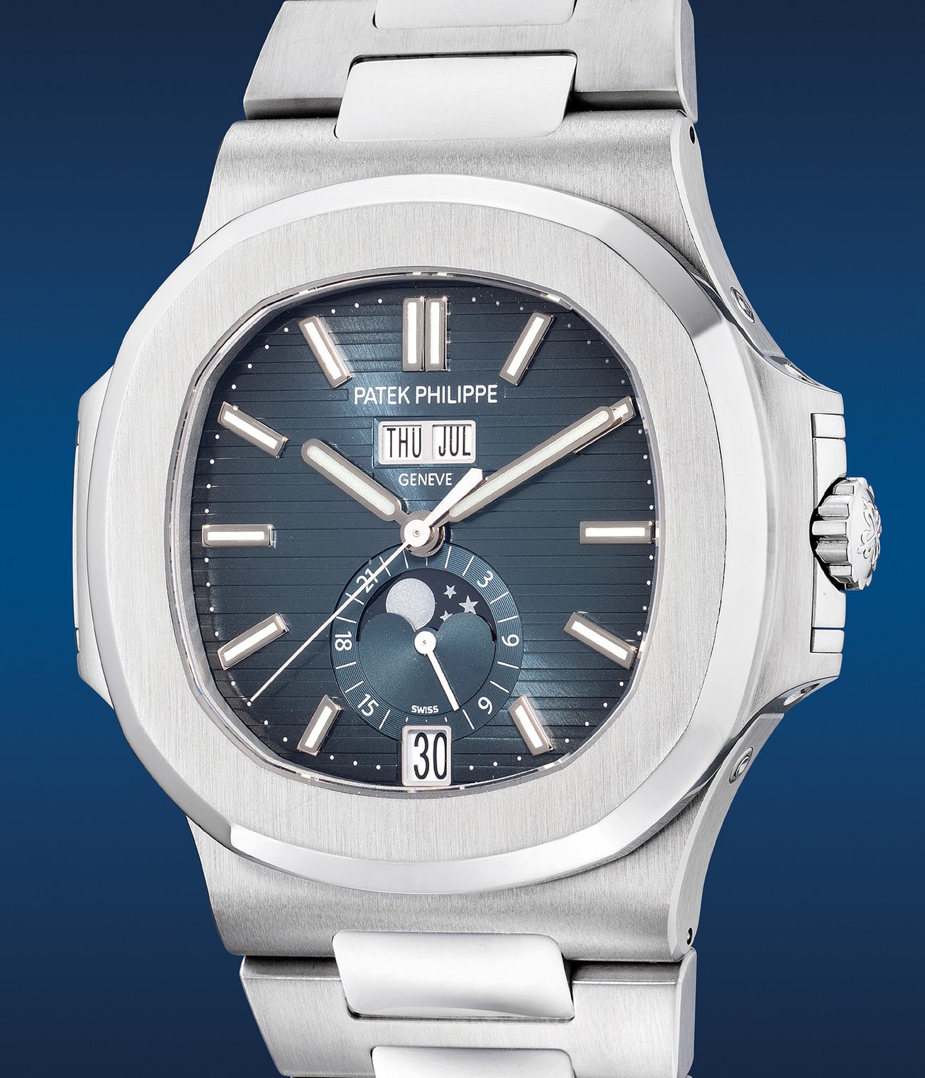 Initially released in stainless steel with a grey dial and fitted with a leather strap, the perfectly symmetrical dial layout was quickly appreciated by collectors and in 2012, Patek Philippe released an example with a white dial. With both variants discontinued, Patek Philippe released the ref. 5726/1A-014 featuring a blue dial and a bracelet in 2019.