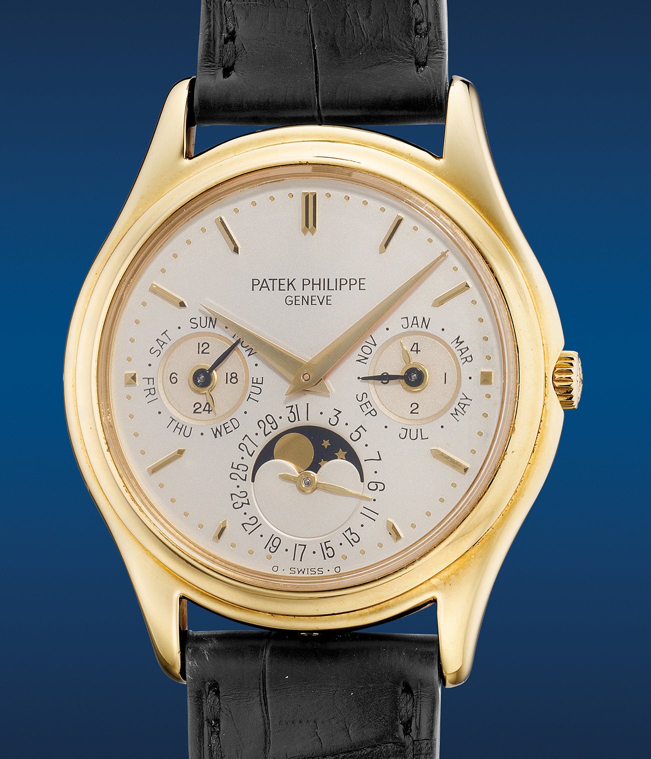 The present ref. 3940 bearing a movement number 770’610 belongs to the first series with a production of no more than 1300 pieces. These early specimens featured flat, sunken subsidiary dials displaying 24-hour indicator as well as the leap year indicator, later models will have a cross dividing the four sectors of the leap year. Fresh-to-the-market and delivered with the Patek Philippe Extract from the Archives confirming its date of manufacture and sale date in the Summer of 1987, the present specimen is preserved in an excellent condition. With subsidiary dials that have developed an attractive light patina that further elevated its vintage charm that will sure please any collector of iconic wristwatches.