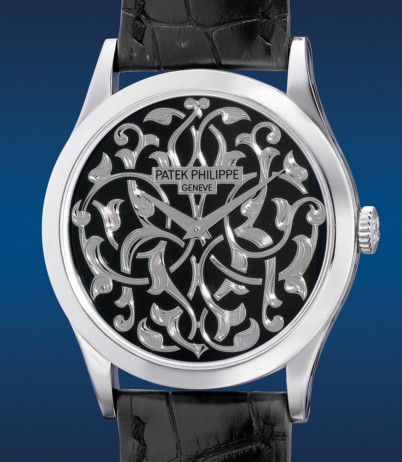 A very rare, extremely fine and highly attractive platinum wristwatch with hand-engraved champlevé enamel dial, Certificate of Origin and presentation box