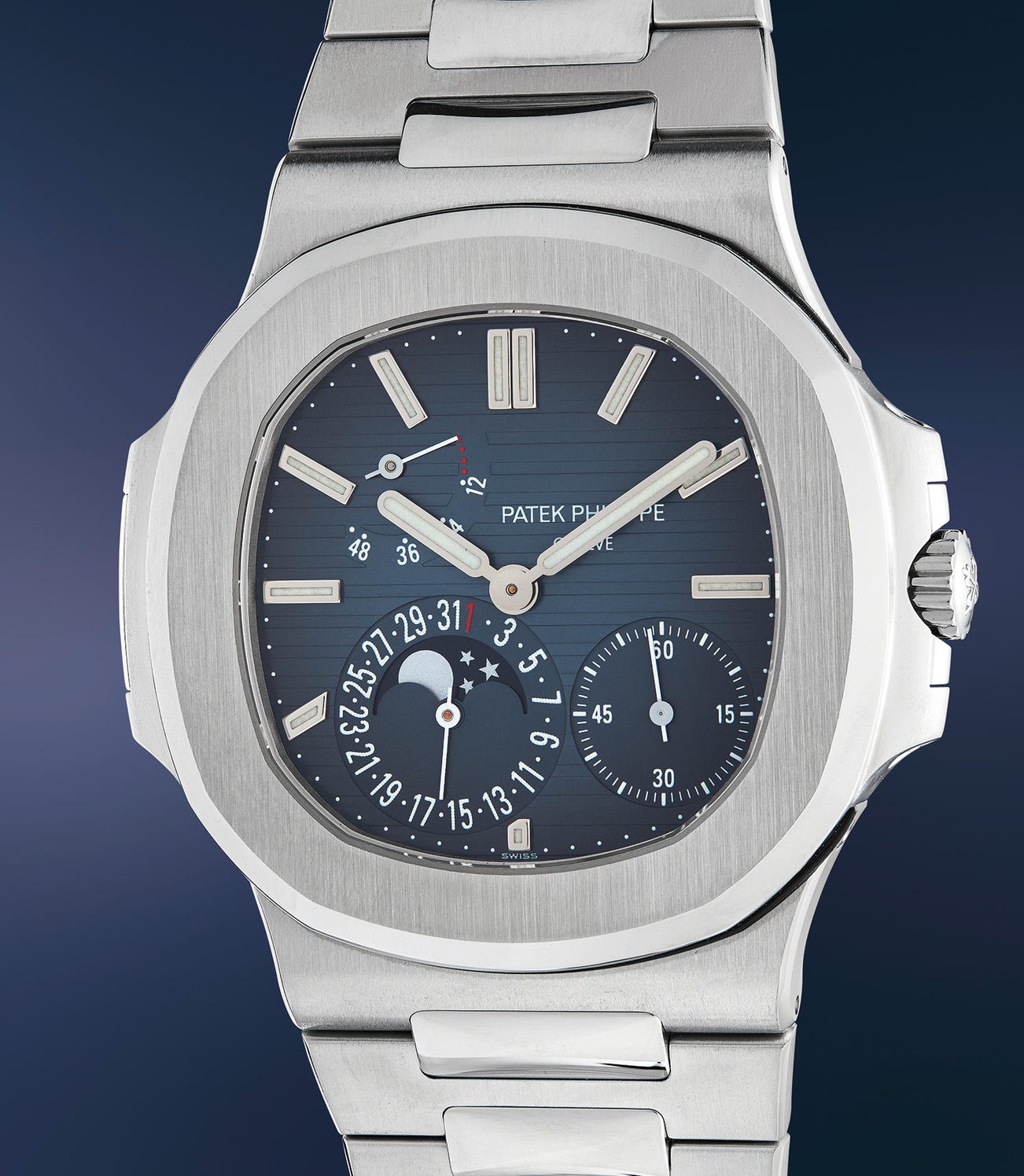 Displaying the date, power reserve and moon phase complication, the reference 5712 was the successor of reference 3712, which was the first complicated Nautilus model. The new version featured a larger case at 42.5mm in diameter, and the dial had narrower grooves. Made to celebrate the 30th anniversary of the Nautilus in 2006, the reference 5712 was a commercial success. Its classic appeal, combined with a hefty presence makes it one of the most desirable modern sports watches available on the market today. In fact, it is incredibly difficult to obtain one at a Patek Philippe retailer and requires years of waiting to be allocated one.
