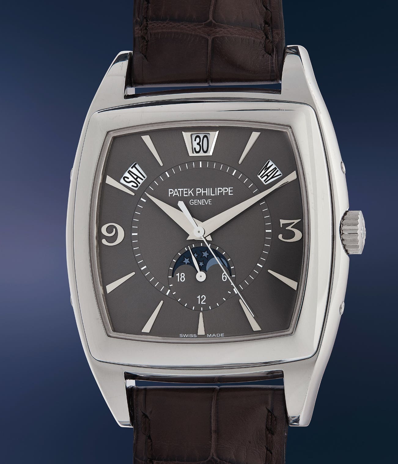 Patek Philippe’s reference 5135 was launched in 2004 in yellow and white gold, and remained in production until 2010, with the platinum and pink gold versions added during the production run. It was available with three different dial configurations: the yellow gold version was fitted with a two-tone silver dial, the pink gold with a rose two-tone one, and the white gold and platinum versions could feature either a two-tone anthracite or silver dial. The very generously proportioned case was made by Patek Philippe's in-house casemaker Atelier Réunis, and the dial by Stern Créations, also in-house.