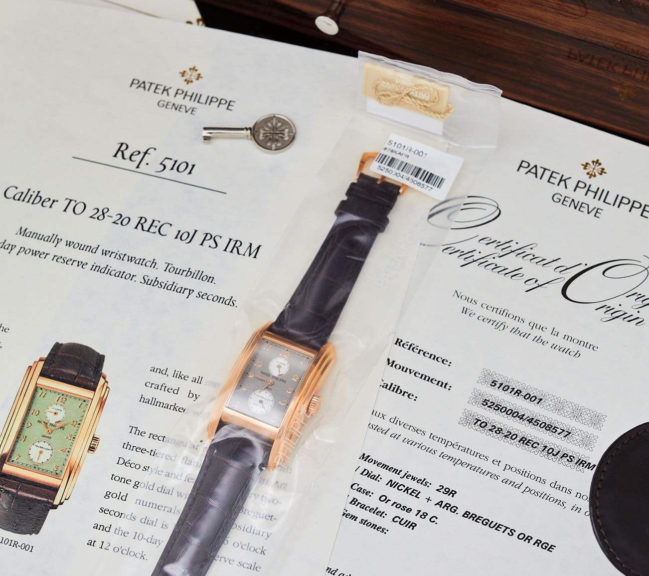 As far as tourbillons go, Patek Philippe is notable for being tastefully subtle with their use of the complication, preferring not to reveal the mechanism through the dial. This is done with a specific intention - to decrease the susceptibility of the tourbillon-equipped escapement losing oil via exposure to UV rays – but also serves to set Patek Philippe apart from its competitors. The two-tone dial of this reference 5101 is remarkably clean and attractive, with two sub dials, one indicating the power reserve, the other the subsidiary seconds with the word “Tourbillon” and the serial number discreetly printed within. Only the wearer, and those enlightened connoisseurs would be able to discern exactly which complication resides within.