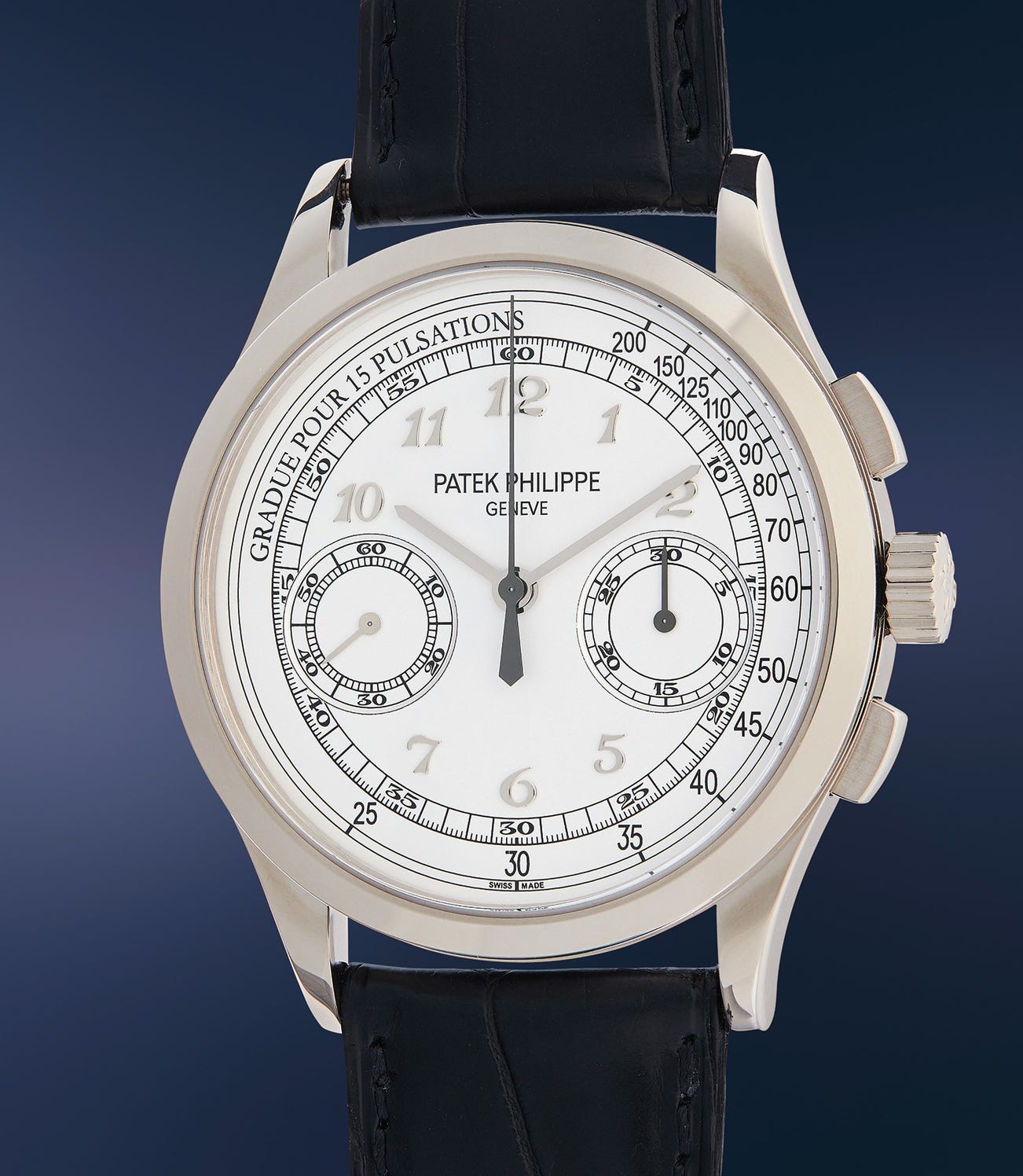 The white gold version of the reference 5170 was introduced in 2013, with the distinctions of having a dial with applied Breguet hour markers and pulsometer scale. With a slim yet sizable case profile, the 5170 is highly discreet and wearable - a perfect watch for the office, board meeting, or for weekend wear. Stamped with the Patek Philippe Seal, the caliber CH 29-535 PS winds smoothly and beautifully, and the chronograph pushers have extremely satisfying haptics. The present example is offered in excellent condition from the original owner’s family, with all of its original accessories.