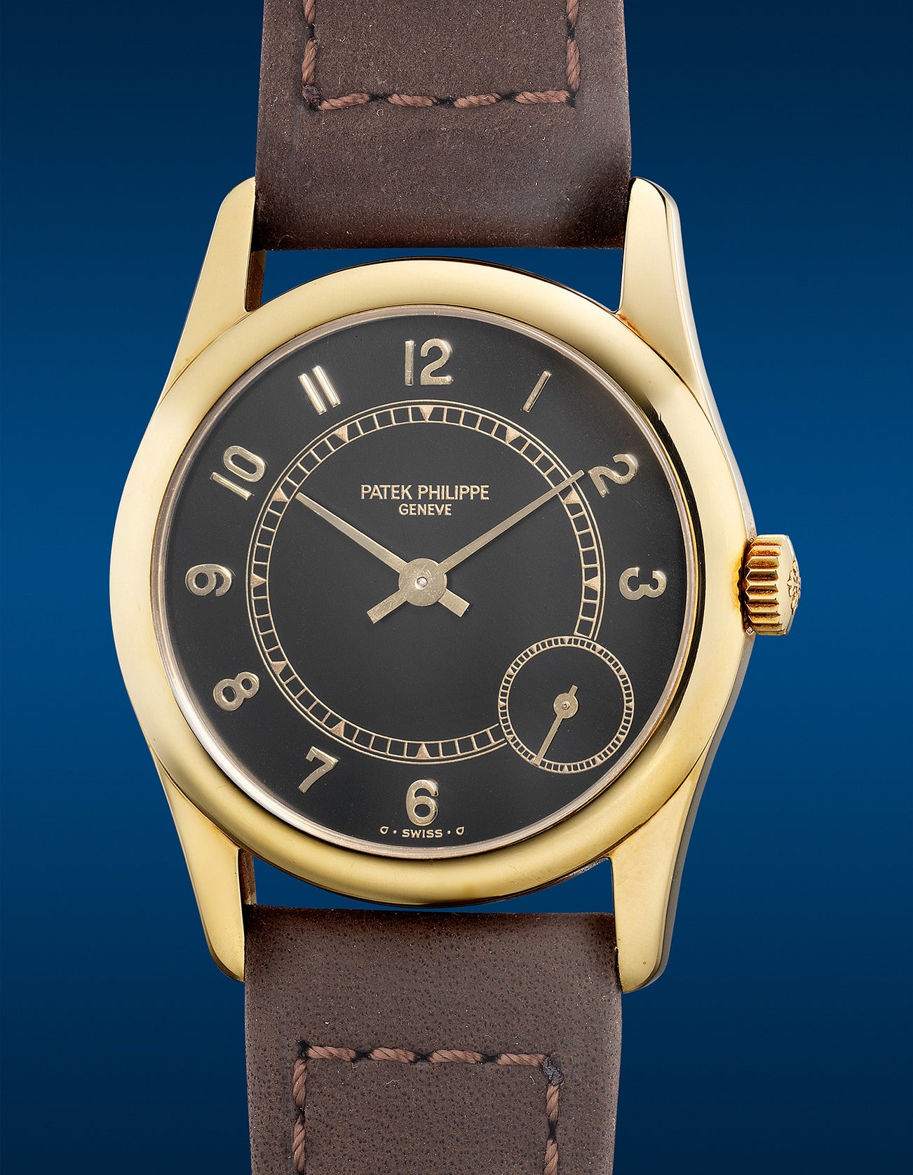 The model’s immediate success was not only a tribute to its ideal size but also its sapphire case back that reveals the inner workings of the automatic movement, with emphasis on the cal. 240 featuring a micro-rotor. The present example offers a delicious black dial adorned with hand-applied bassine style Arabic numerals, an internal railway minute track and eccentric subsidiary seconds in yellow gold. The potent combination of these features is a harmonious marriage between the maker’s early pocket watch aesthetics and today’s effortless modern design.