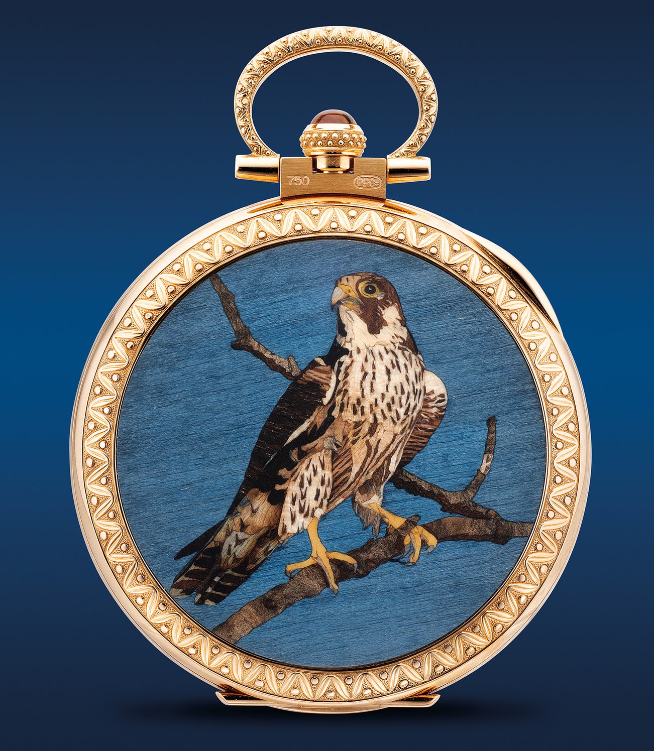 Presented as part of the Rare Handcraft collection in 2013 as a piece unique, the Peregrine Falcon open-faced pocket watch ref. 982/147 exhibits the spectacular decoration of Marquetry, a technique consist of stacking sheets of veneer into black, followed by a cutting process to produce fine wood pieces that only a handful of marquetry makers can assemble into art pieces. Depicting a symbol of freedom, the Peregrine Falcon is an elite predator also known as the wanderer is the world’s most widespread raptors that reaches a speed up to 200 miles per hour during their hunt. Nearly photorealistic and framed by an artistically engraved bezel in 18K pink gold, the eminent falcon resting on a branch is crafted in wood intarsia, consisting of 250 pieces of 20 different wood species into one to complete the dial. Turning the watch over is the equally stunning watch face finished with marquetry in blue-dyed Maplewood with inlays of pink-speckled pietersite (semi-precious gem) for the power reserve indication and the small seconds register. Featuring the elegance of Breguet numerals in matching pink gold, the slender leaf-shaped hands tells time with grace. The elaborate relief engravings not only grace the bezel of the watch, but also the bow and the winding crown which is set with a red pietersite cabochon that perfectly matches the falcon’s feathers. Powered by the manually wound calibre 1-17 LEP PS with small seconds, the movement reveals the mark of excellence, the Patek Philippe seal.