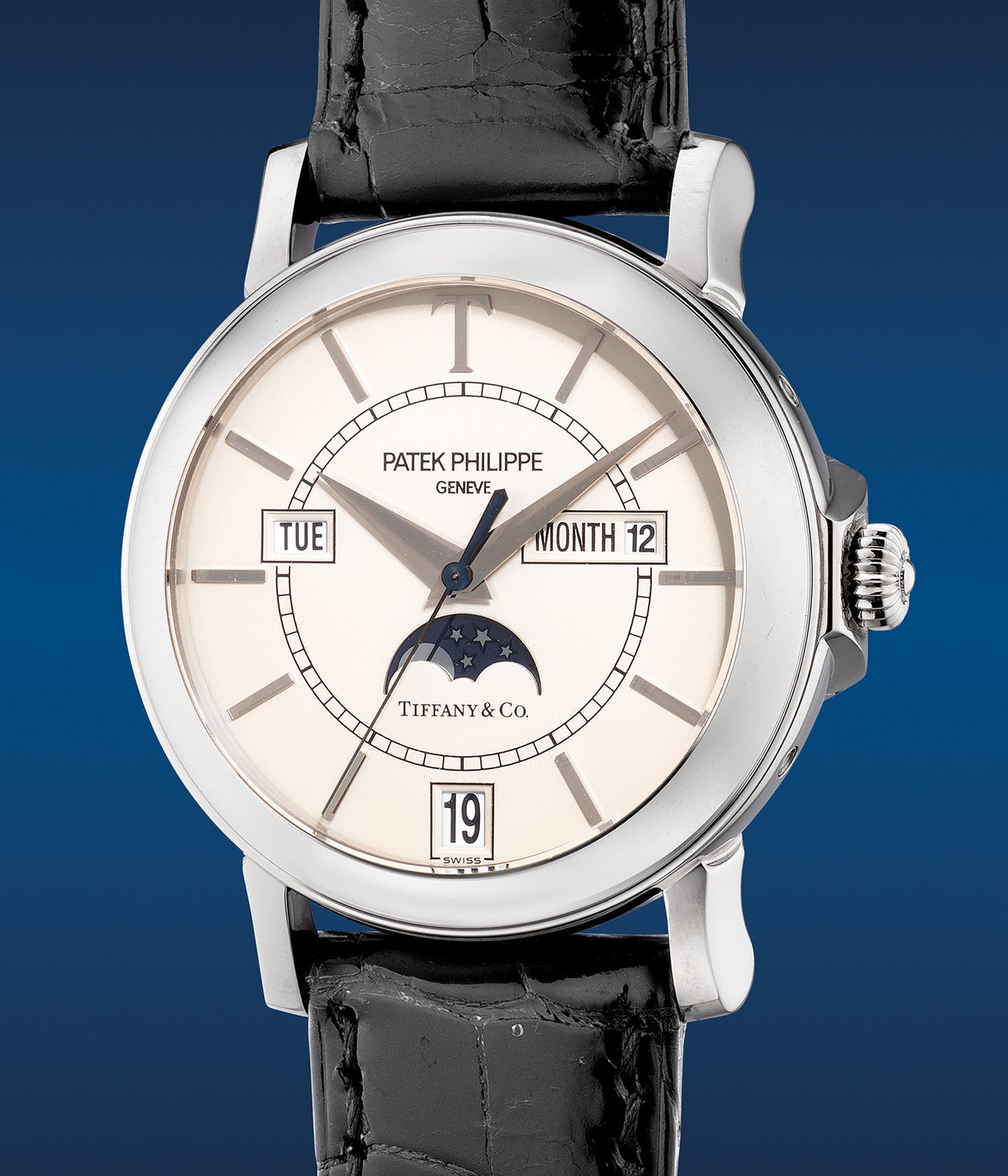 Unique to this reference, it features an aesthetic exception amongst the firm’s traditional annual calendar design. Under the creative involvement of Thierry Stern, the month is indicated as a numeral rather than the usual text form for the very first time. Graced with an oversized T (the wordmark of the retailer) at 12 o’clock and Tiffany & Co. signature sitting underneath the moon phases, the 5150 were made in a limited edition of 150 examples each in yellow, white and pink gold. Furthermore, the caseback is immaculately engraved with the façade of the original workshop in Geneva shared by the two during the 1860s. Offered in a well-preserved condition, the present 5150T in white gold is accompanied by its full set of accessories from the retailer.