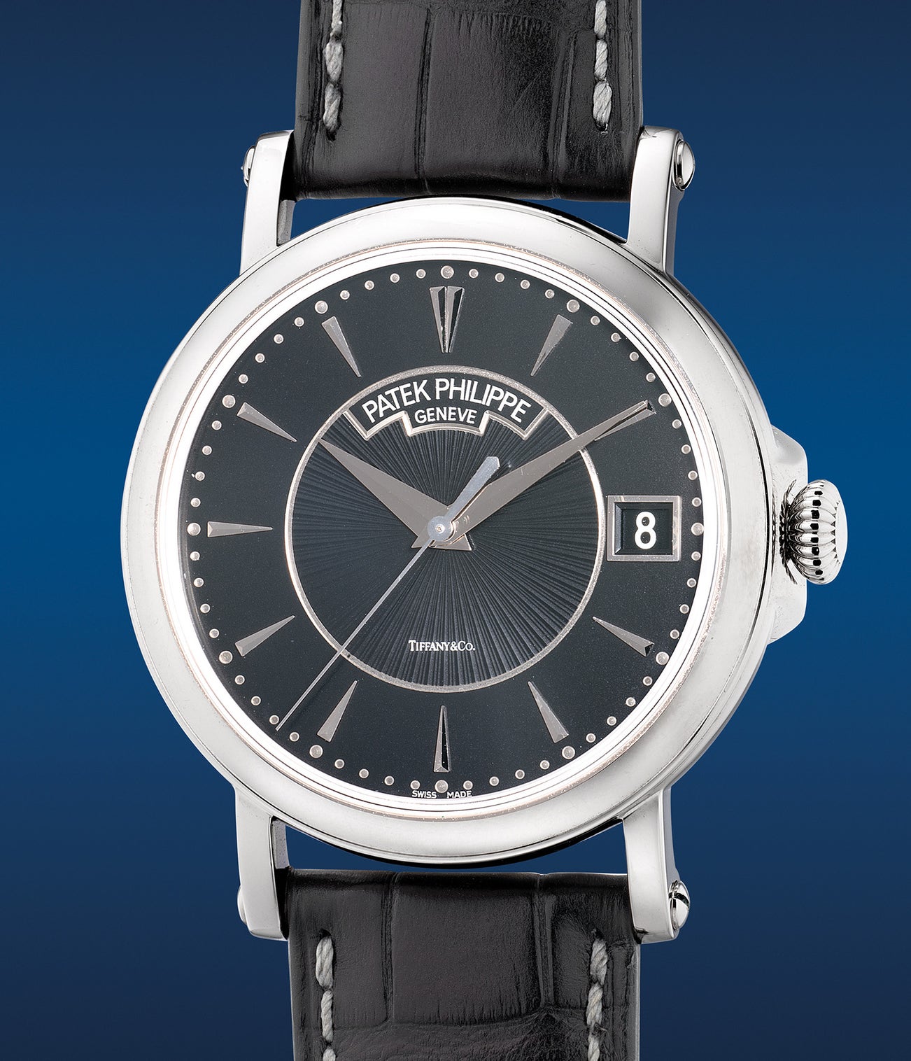 A fine and attractive white gold wristwatch with center seconds, date, officer’s-style hinged caseback, Certificate of Origin and presentation box, retailed by Tiffany & Co.
