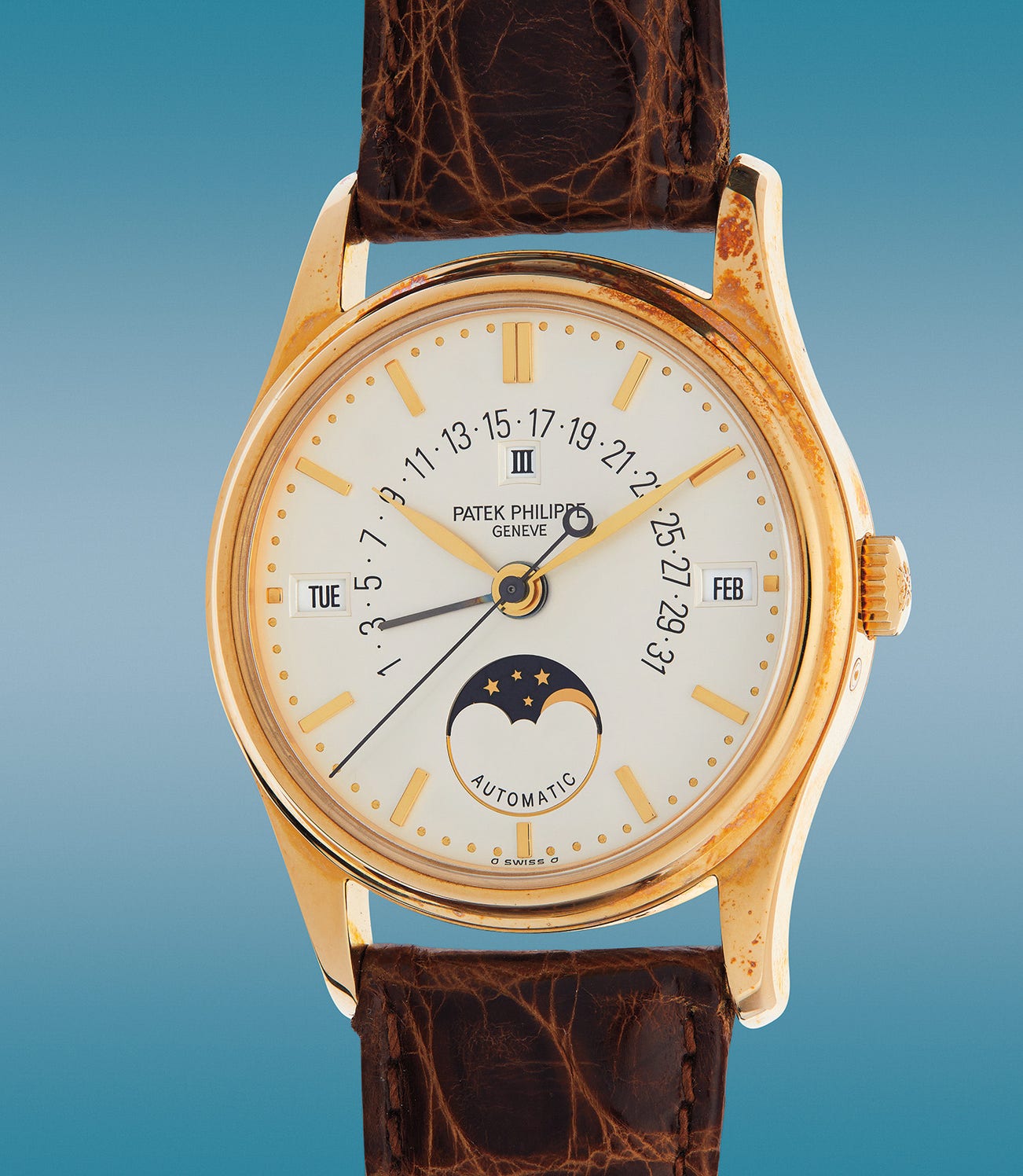 An attractive and well-preserved yellow gold perpetual calendar wristwatch with retrograde date and moon phase