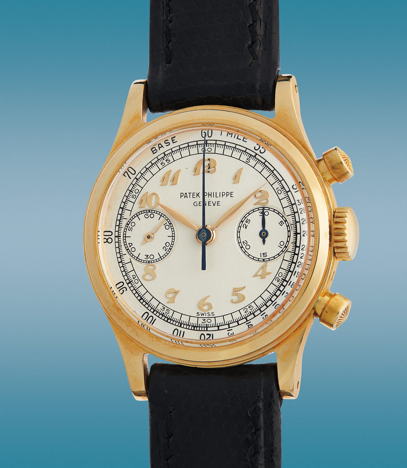 Phillips has been entrusted with several reference 1463s of exceptional quality but has only ever sold one other yellow gold reference with Breguet numerals. Scholarship has only identified a total of 14 examples of the reference 1463 in yellow gold with Breguet numerals. The exceptional example offered here first appeared at auction in 1998 and has not appeared on the market since, having been safe in the inimitable Ride the Wave collection. With the Taubert-fabricated case in the highest state of preservation, this symbol of casual refinement in the golden era of watchmaking is ready to adorn the next great collection.