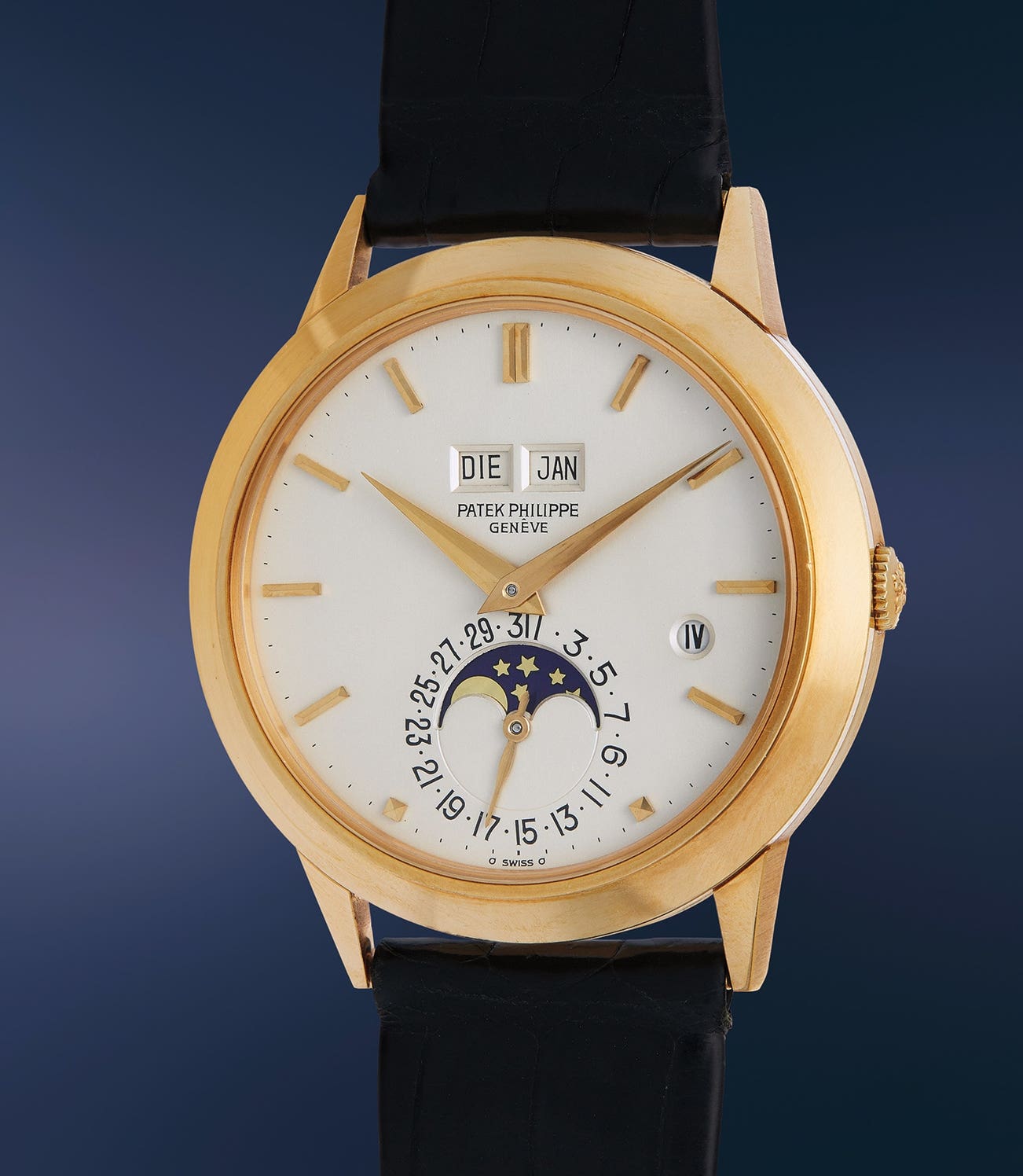 The case design of the model dates to the 1960s with the advent of the reference 3448, when it was a startling departure from previous perpetual calendar case and dial design. The dial is airy and clean, and the aesthetic impact of the watch is defined by the straight, angular lugs and the large, sloping bezel contrasting with the satin-finished case band.