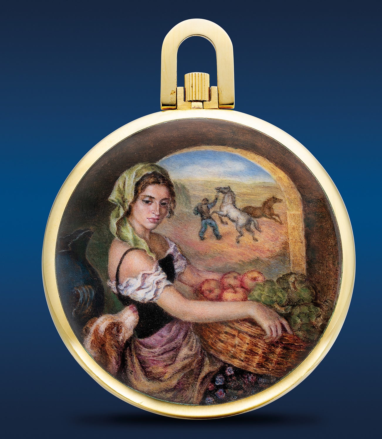 The present Patek Philippe open face pocket watch ref. 866/26 in yellow gold features an exquisite miniature enamel painting of “Retour du Verger” or “Return from the Orchard” by Spanish painter Francisco Ribera Gómez from the early 20th century, it was reinterpreted by master enameller Mrs. Hélène May-Mercier at Patek Philippe in 1974. Mrs Hélène May-Mercier was an enamel miniature painter at Patek Philippe in Geneva from the 1970s until the 1990s. During her career she embellished around 20 watches as well as some cloisonné enamel Dome clocks.