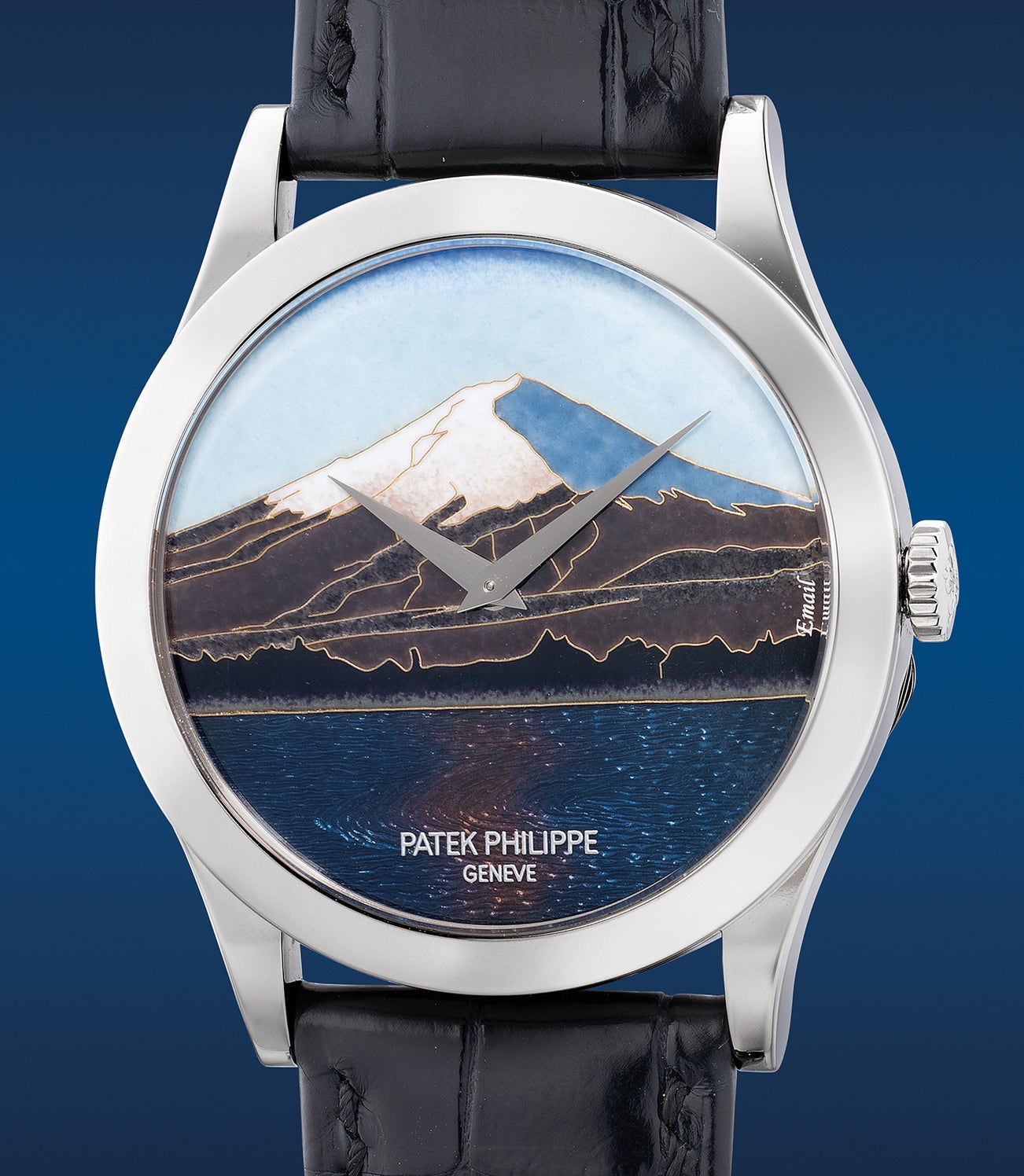 Visible through a sapphire caseback under the hinged caseback, the classic round Calatrava cased in white gold houses the ultra-thin self winding caliber 240 micro-rotor movement. Impressive and a rare treasure of artisanal crafts, the present ref. 5089G-028 is furthermore preserved in stunning condition and is accompanied with its full set of accessories. For those who miss traveling to Japan, the present Mount Fuji Calatrava certainly brings you a little closer to the land of the rising sun.