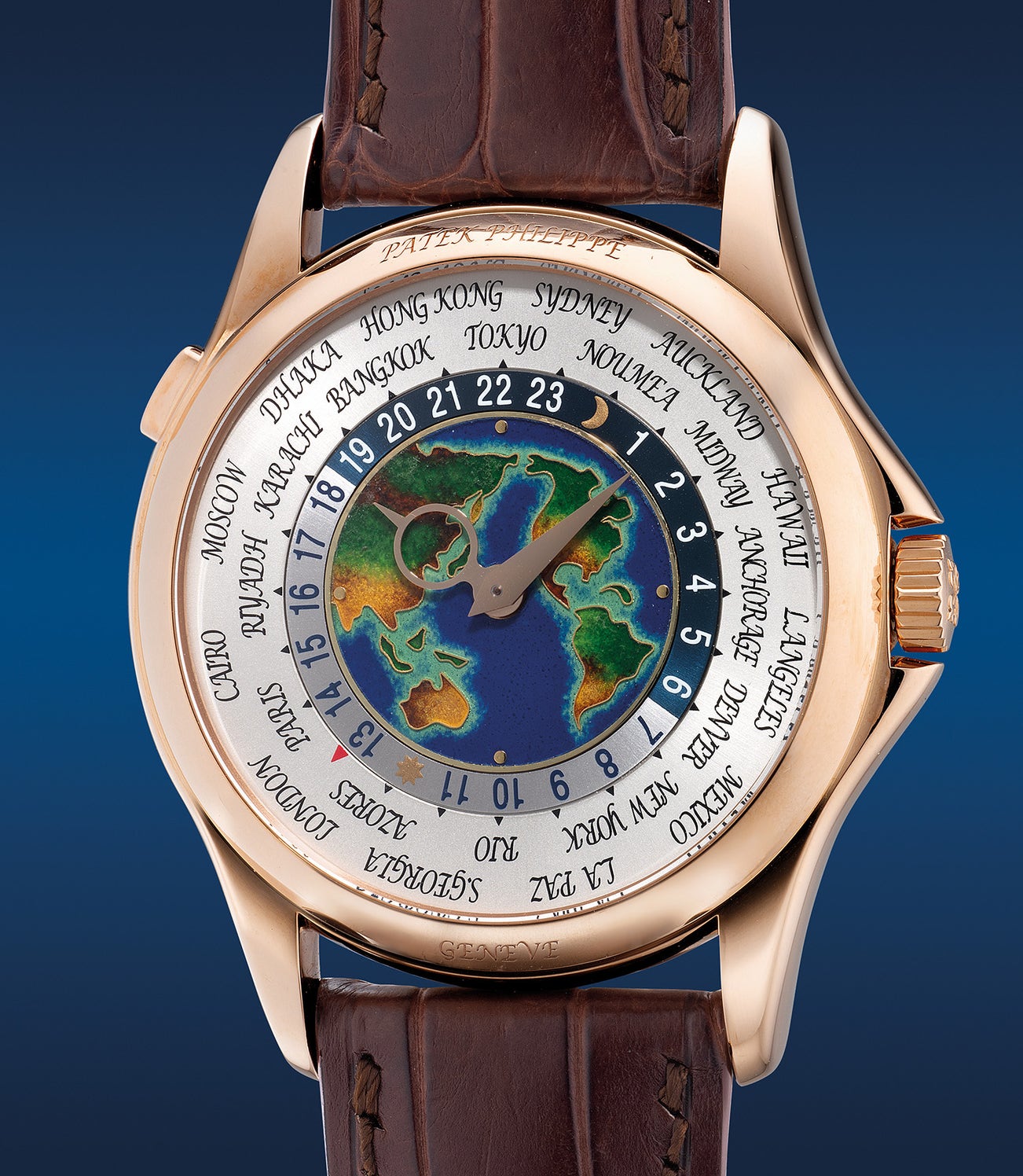 The present example Patek Philippe World Time ref. 5131R-001 features a beautiful cloisonné enamel dial depicting the continents of Asia, Americas and Oceana. Fresh-to-the-market, the present example from circa 2015 is offered with its full set of accessories and preserved in excellent overall condition.