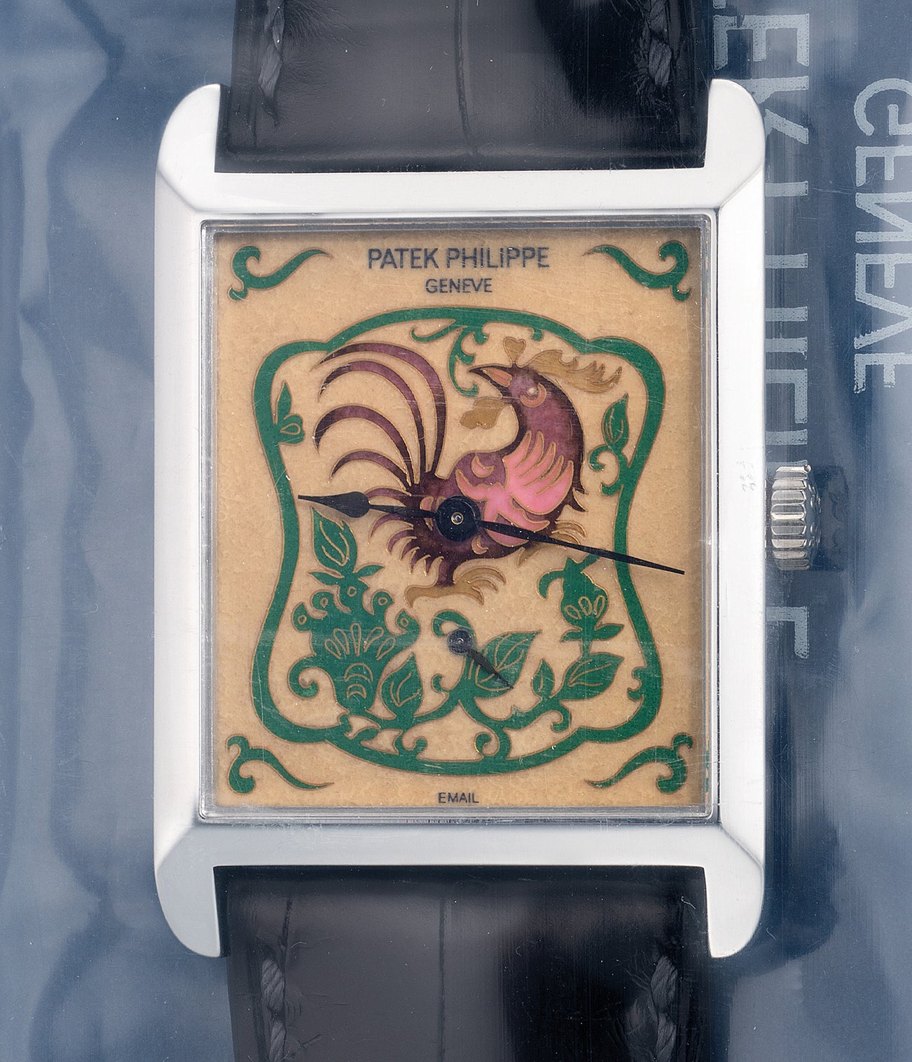A very rare, “like-new” and attractive platinum rectangular-shaped wristwatch with cream “Rooster” cloisonné enamel dial, Certificate of Origin and presentation box