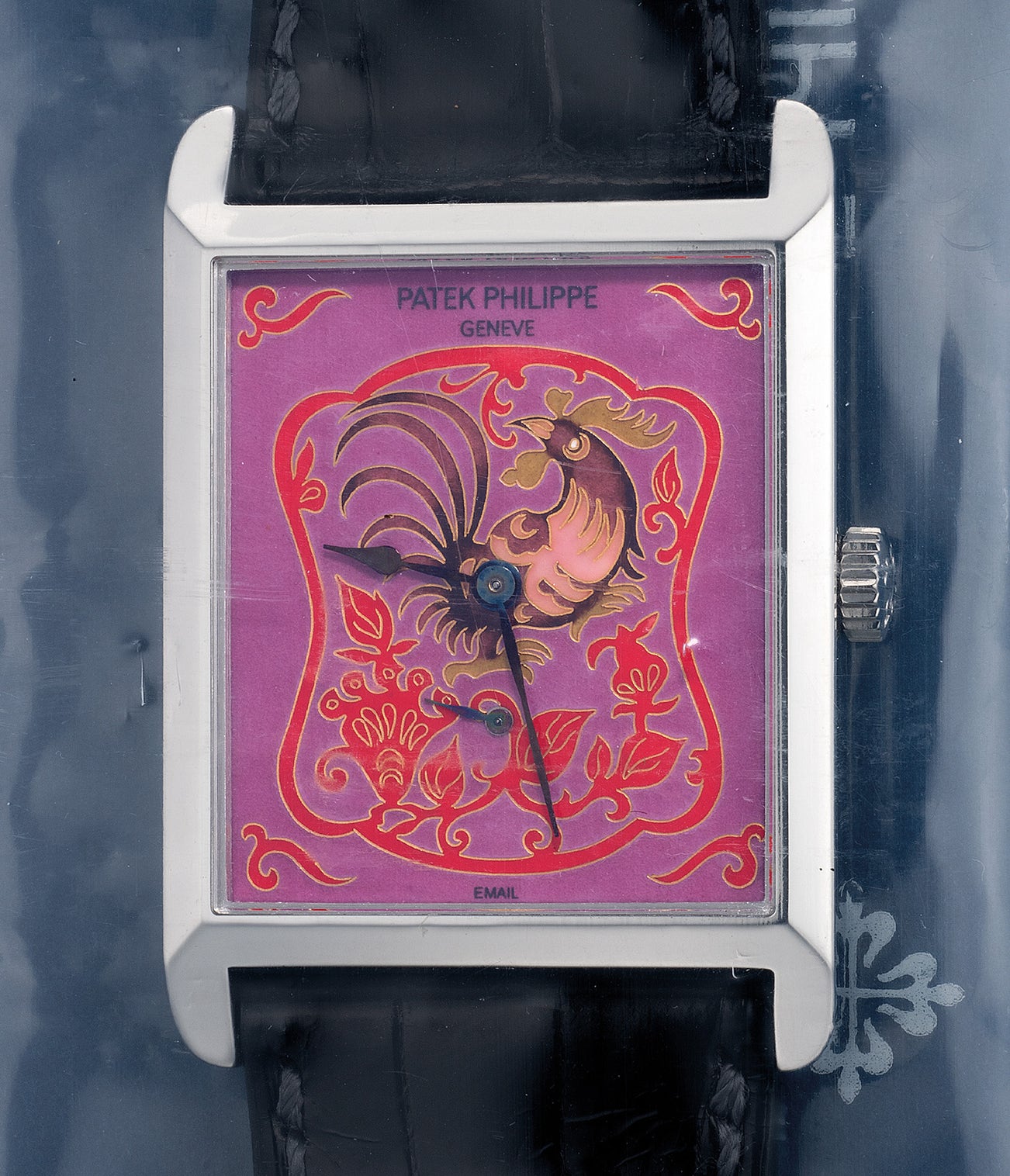 To celebrate the Chinese zodiac, Patek Philippe created sets of four watches each representing the 12 zodiac signs, with each set manufactured during the year of the zodiac indicated on the dial. A symbol of punctuality, bravery and the fresh beginning of a new day, the Year of Rooster themed ref. 5076 cased in a perfect frame of the elegant platinum rectangular Gondolo case sets a grand canvas for the animal. Flourished with flower motifs auspicious colours in red and violet, the gold wires shaped Rooster dances in celebration. Produced in 2005, the set features four different dials, each in a different color. Perfectly preserved, it is the first time all four editions have been offered in the same sale. The Year of Rooster set has never appeared in the market before, making this the first time collectors can get their hands on the fresh-to-the-market set with its Certificate of Origin and accessories, the present example is definitely a beauty for the connoisseurs with an appreciation of artisan timepieces.